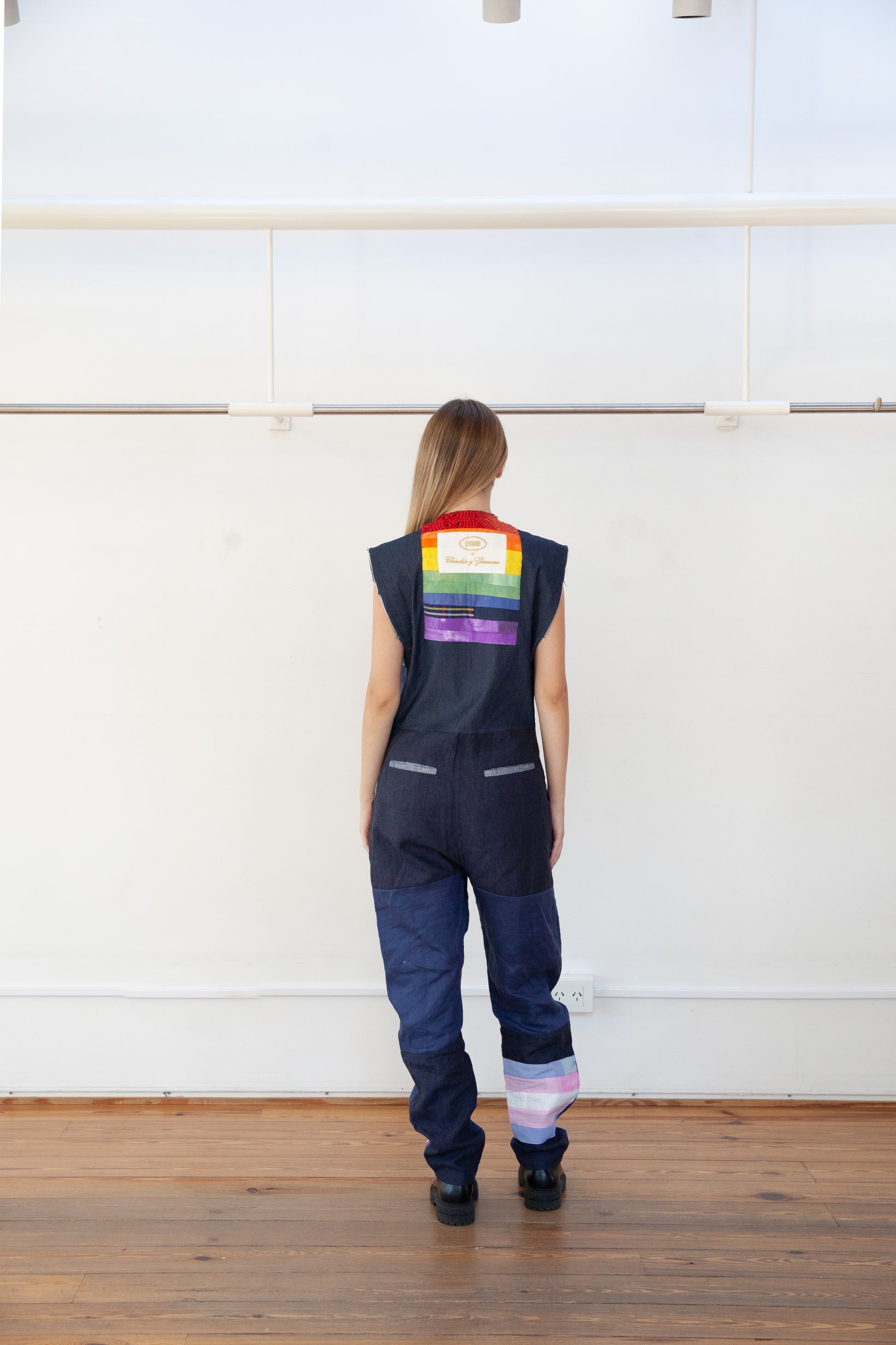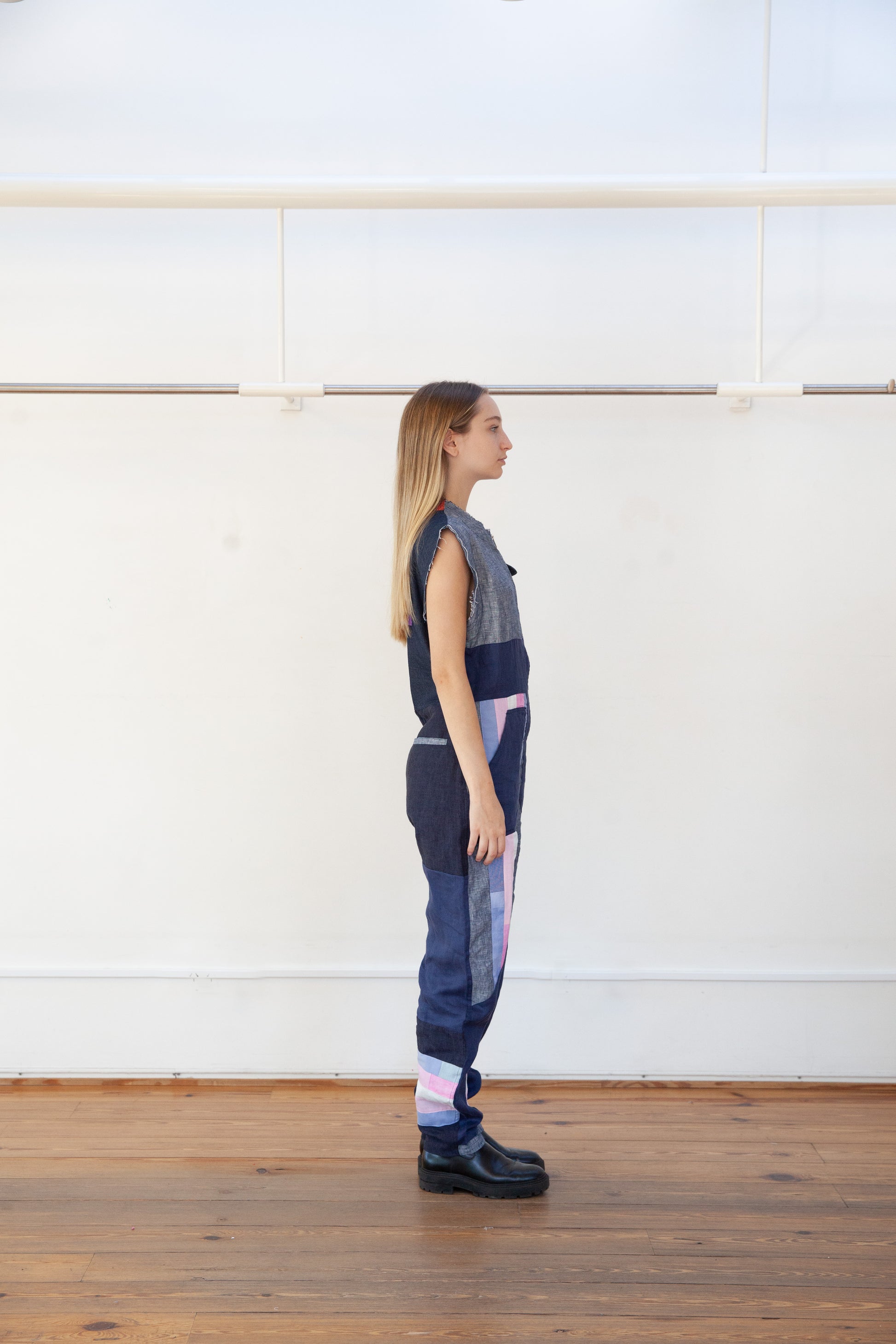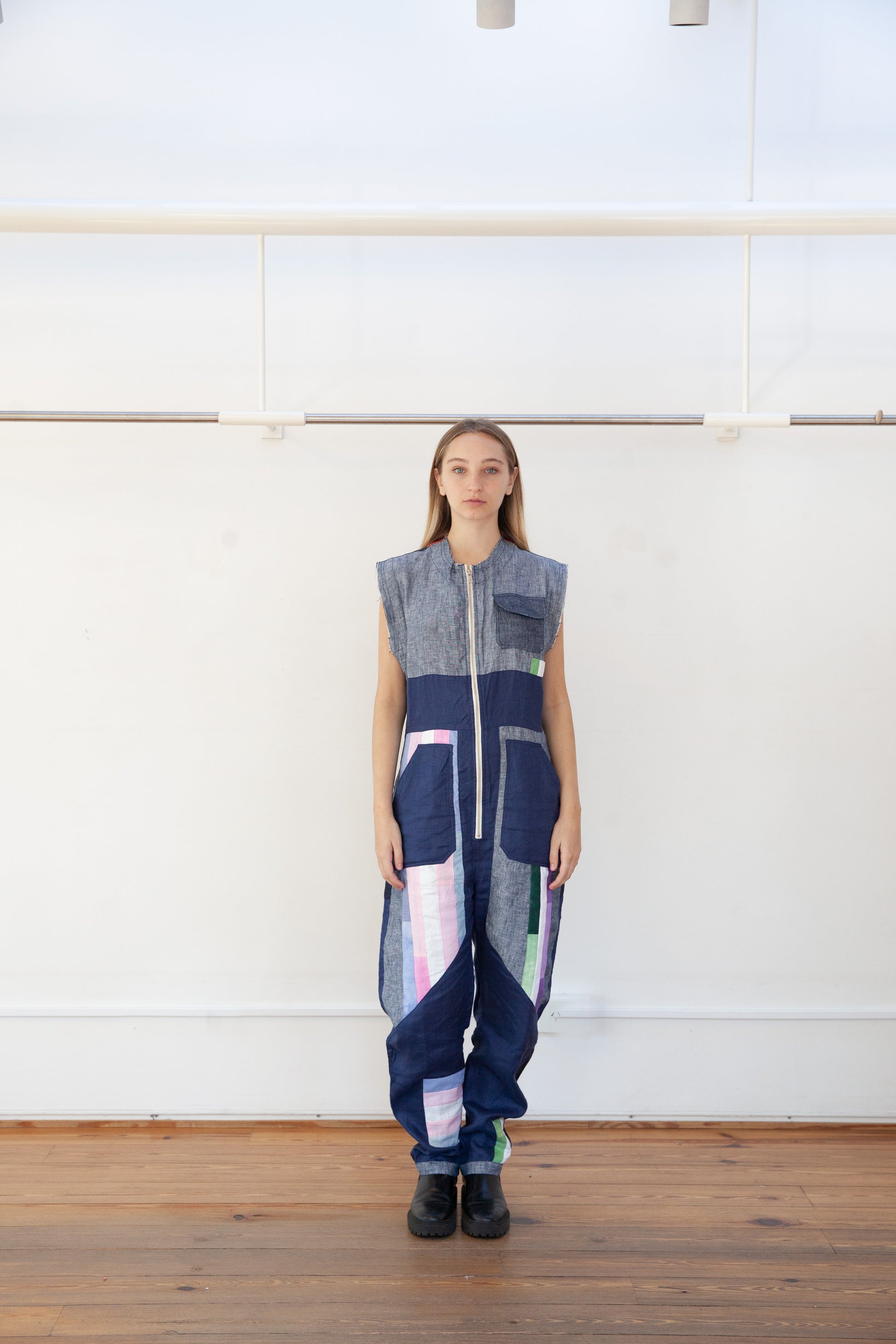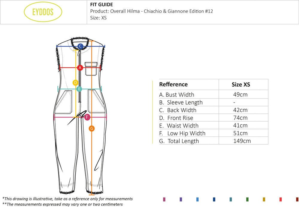 Overall made of italian linen 100%linen, with a variety patch of fabrics. It has a contrasting front zip fastening. The neckline, armholes, and pants are finished with a raw cut. The bottom has a conventional length. The fit is regular, noticeably accentuating the waist, while creating a wider silhouette around the hips.