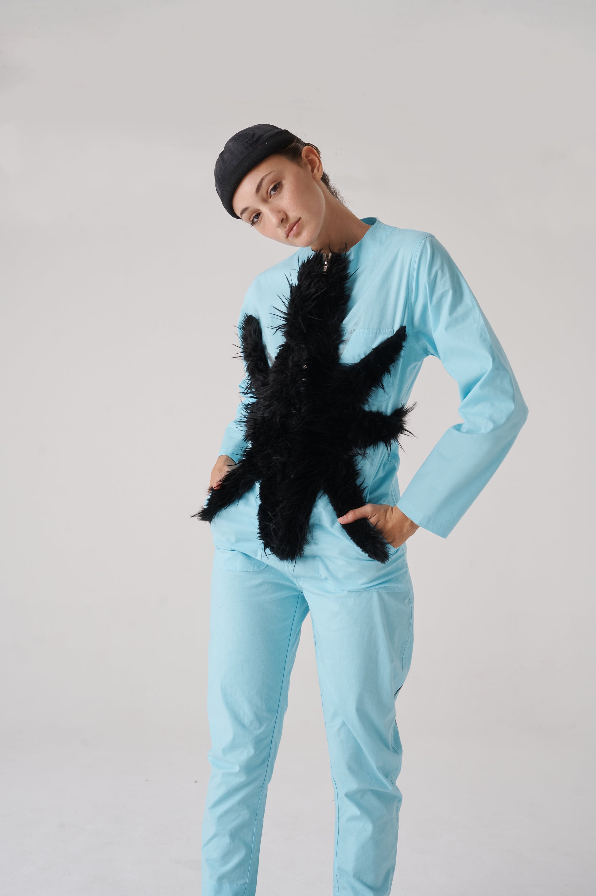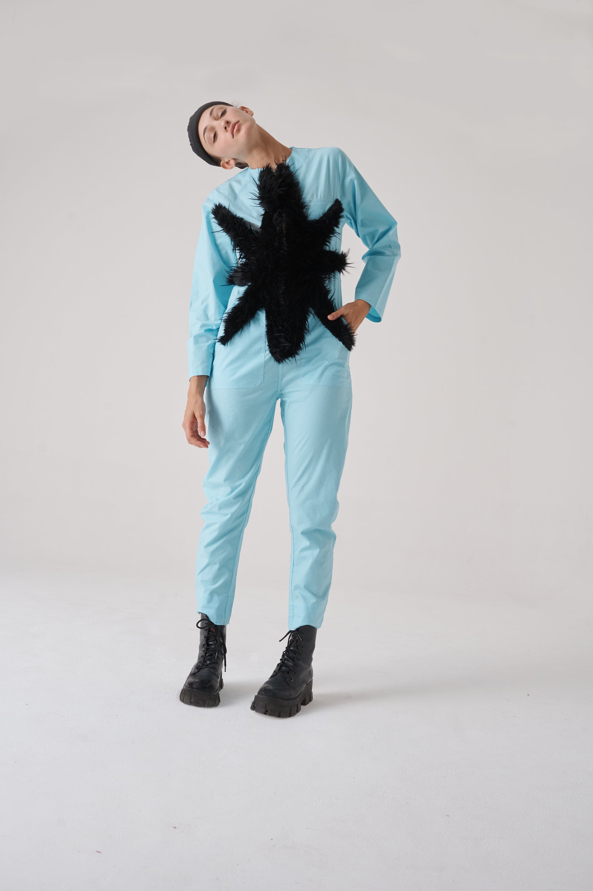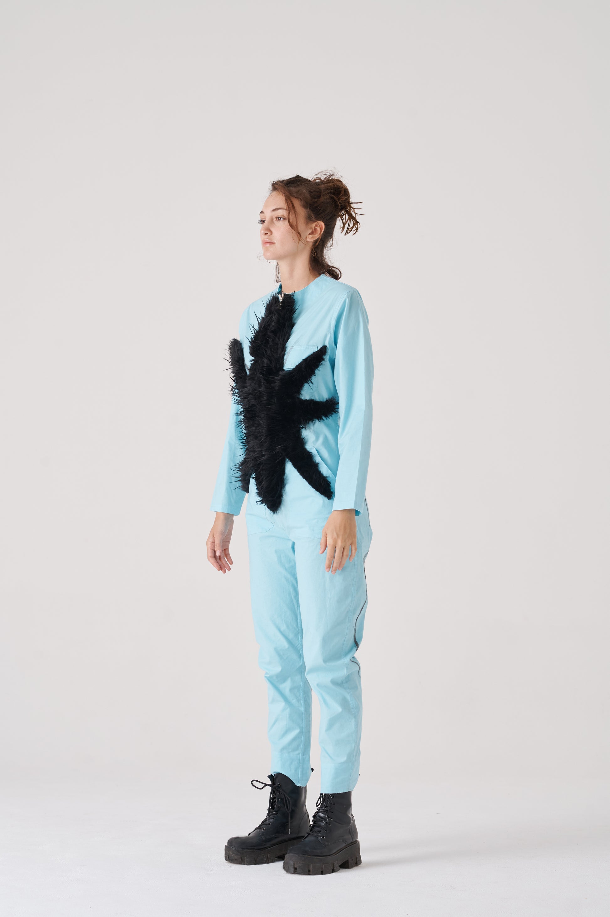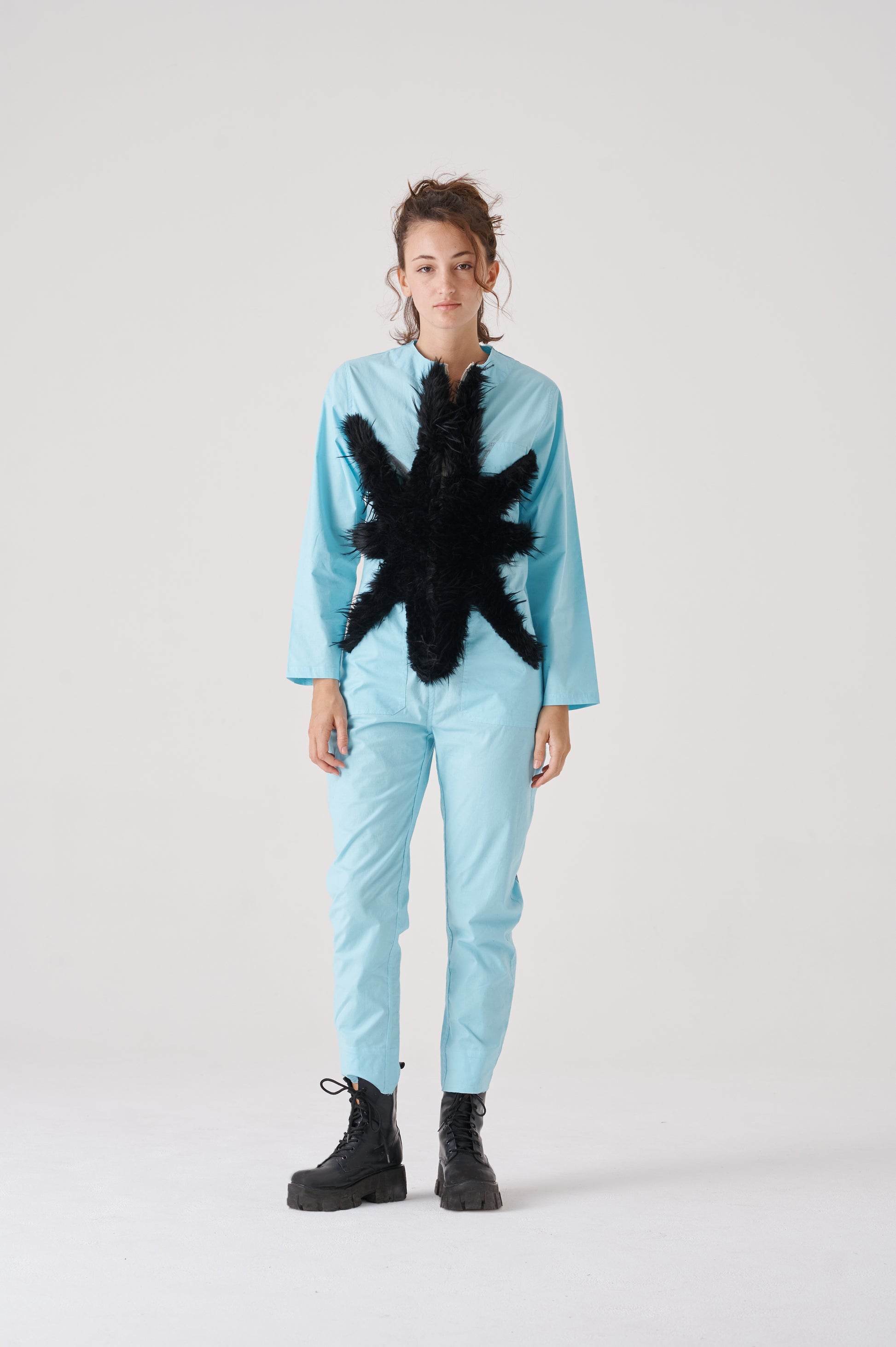 Overall made of poplin, 98% cotton 2%spandex. It has a contrasting front zip fastening. The sleeves are long, and the bottom has a conventional length. The fit is regular, noticeably accentuating the waist, while creating a wider silhouette around the hips.