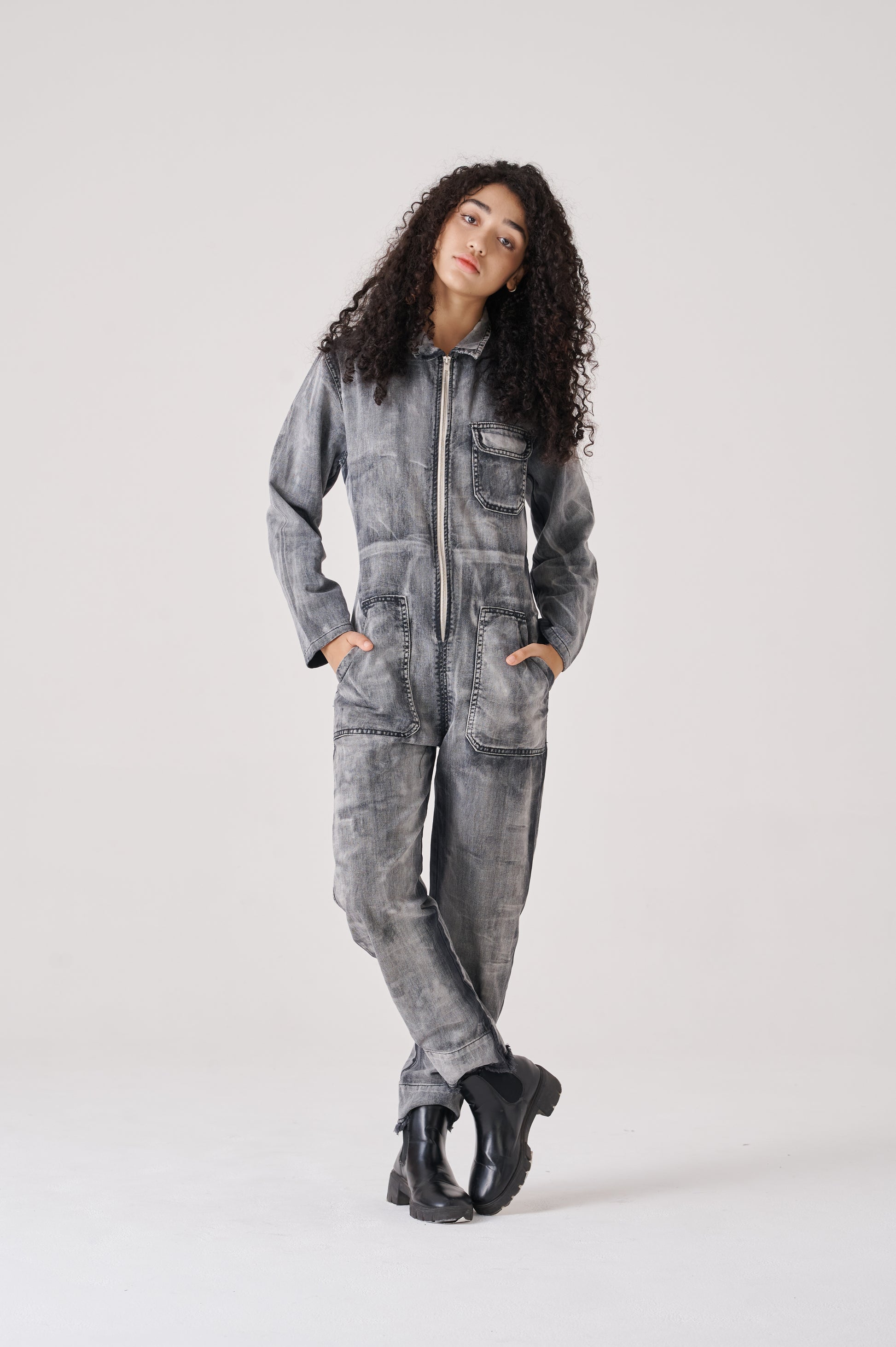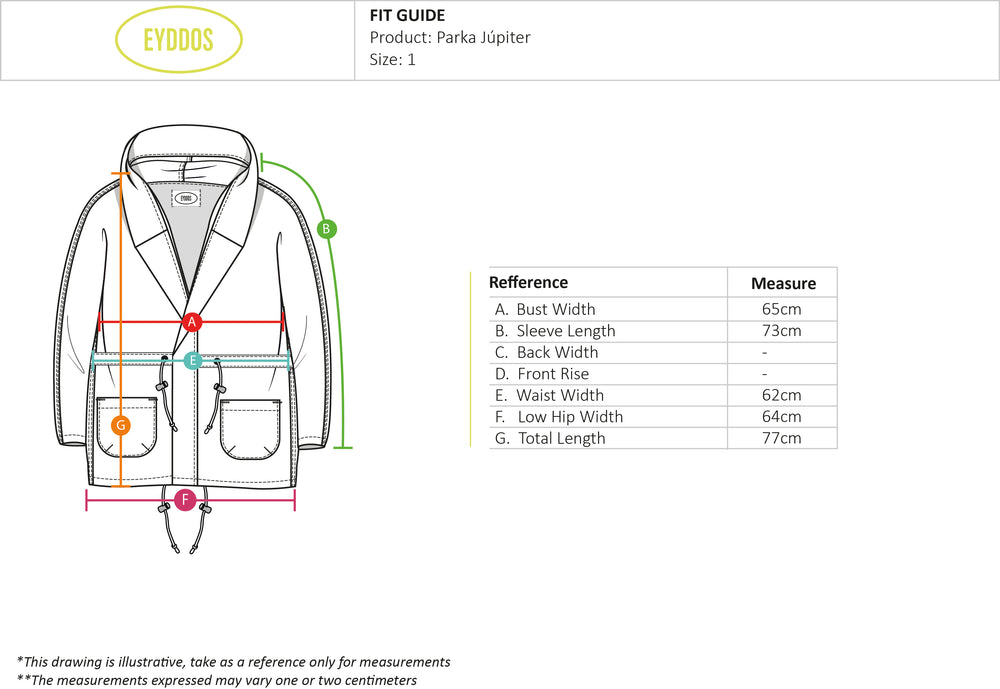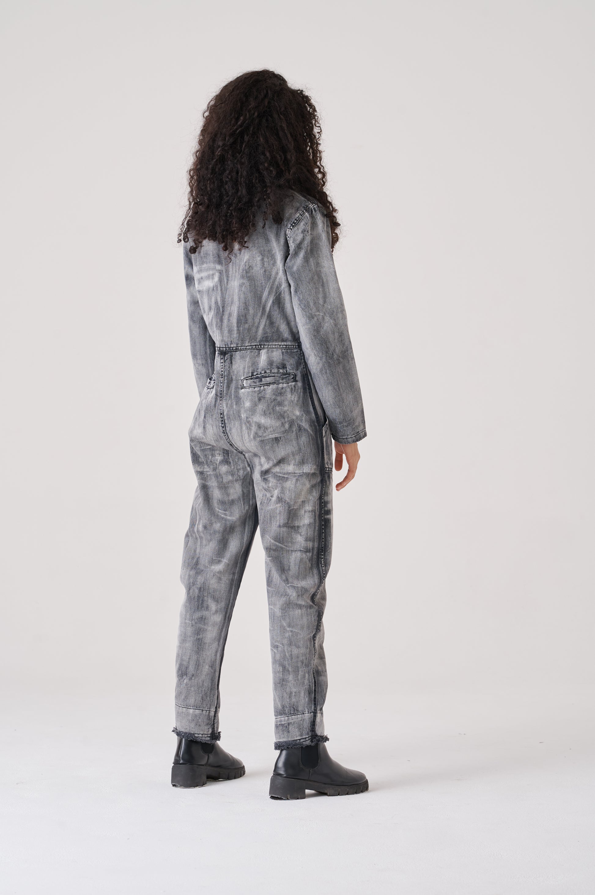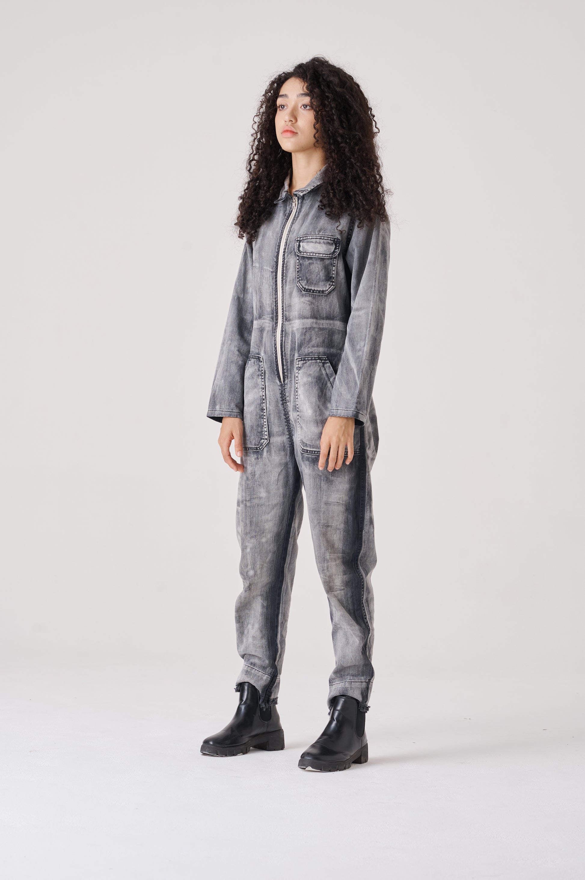Overall made of canvas 100% cotton. It has a contrasting front zip fastening. The neckline, armholes, and pants are finished with a raw cut. The bottom has a conventional length. The fit is regular, noticeably accentuating the waist, while creating a wider silhouette around the hips.