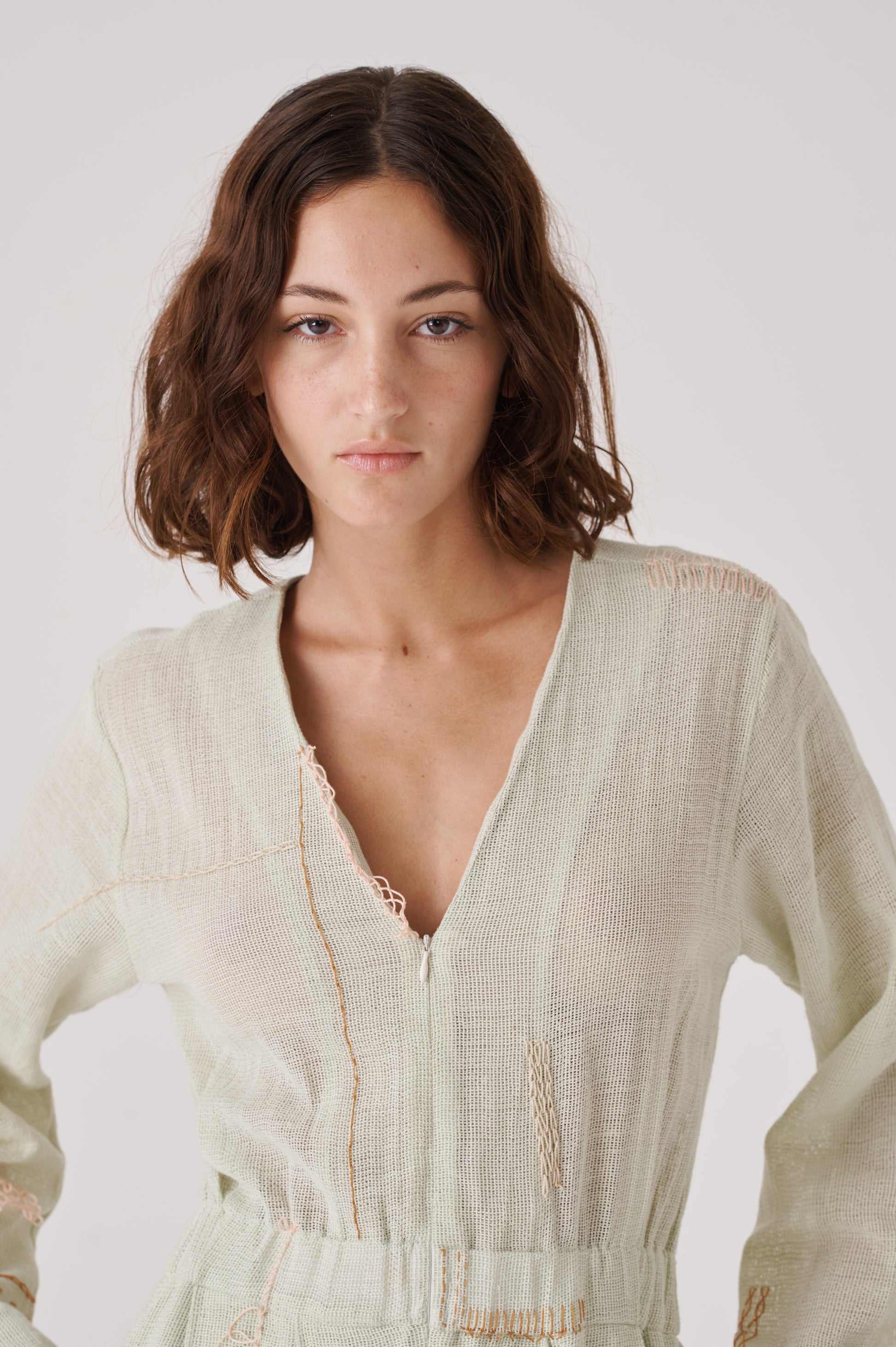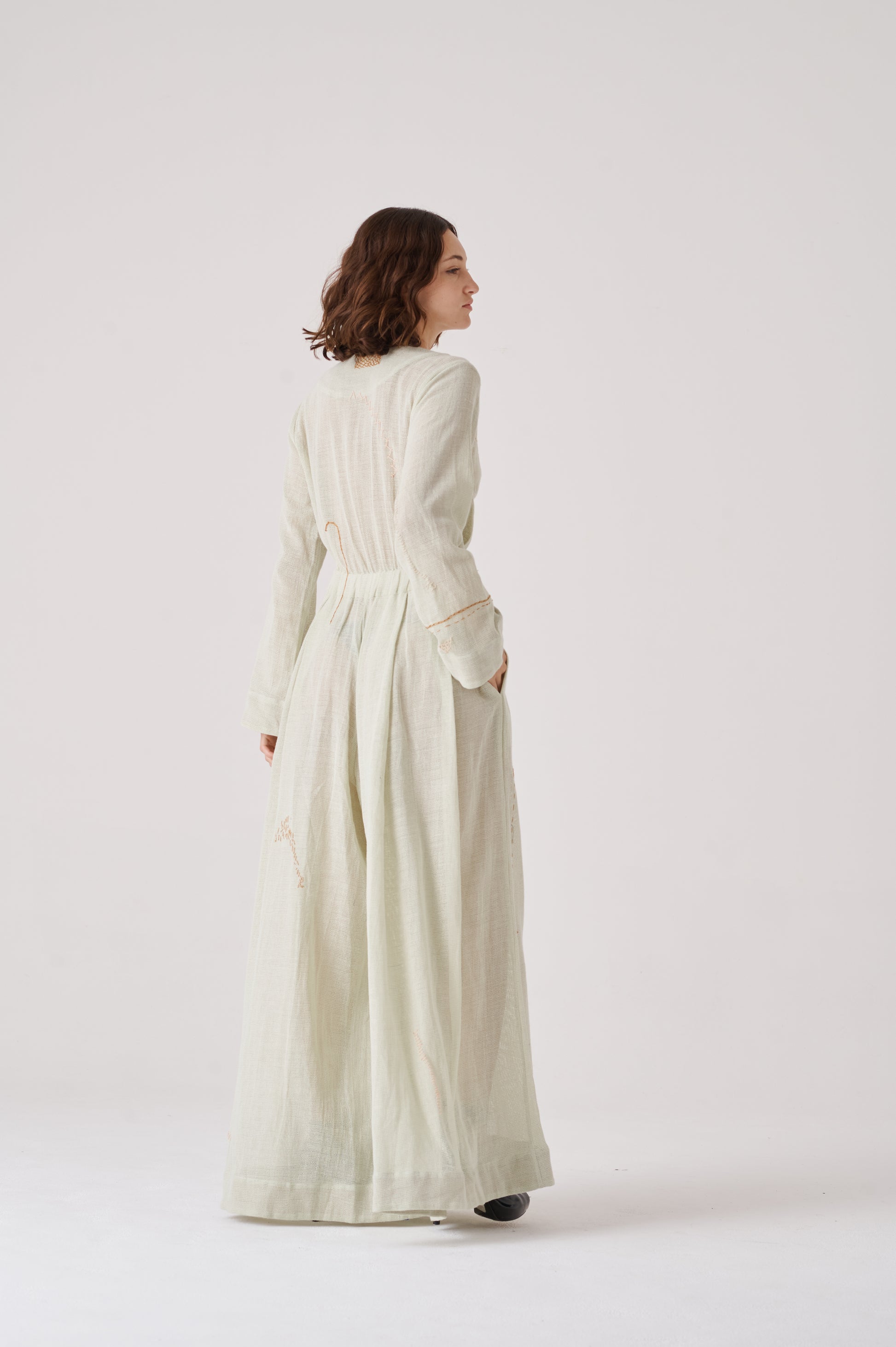 Her work explores the structural foundations of textiles and the dissemination of their techniques. Through these principles, she creates sculptures that highlight the craftsmanship and three-dimensional nature of textiles, defying gravity by replacing the soft structure of threads and fabrics. Her practice incorporates a variety of techniques, including crochet, macramé, felting, trimmings, embroidery, lace, knitting, weaving, natural dyeing, and sewing.