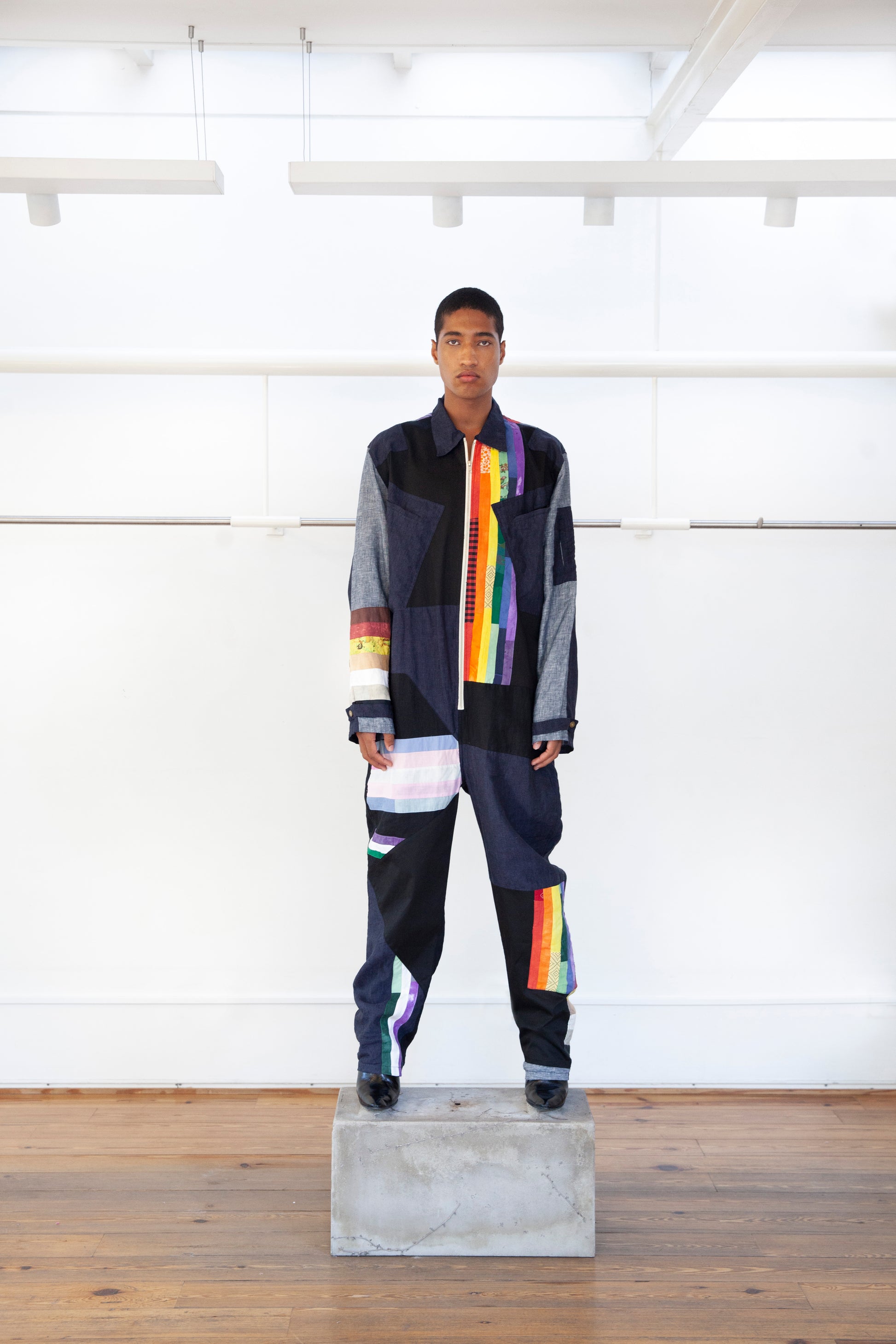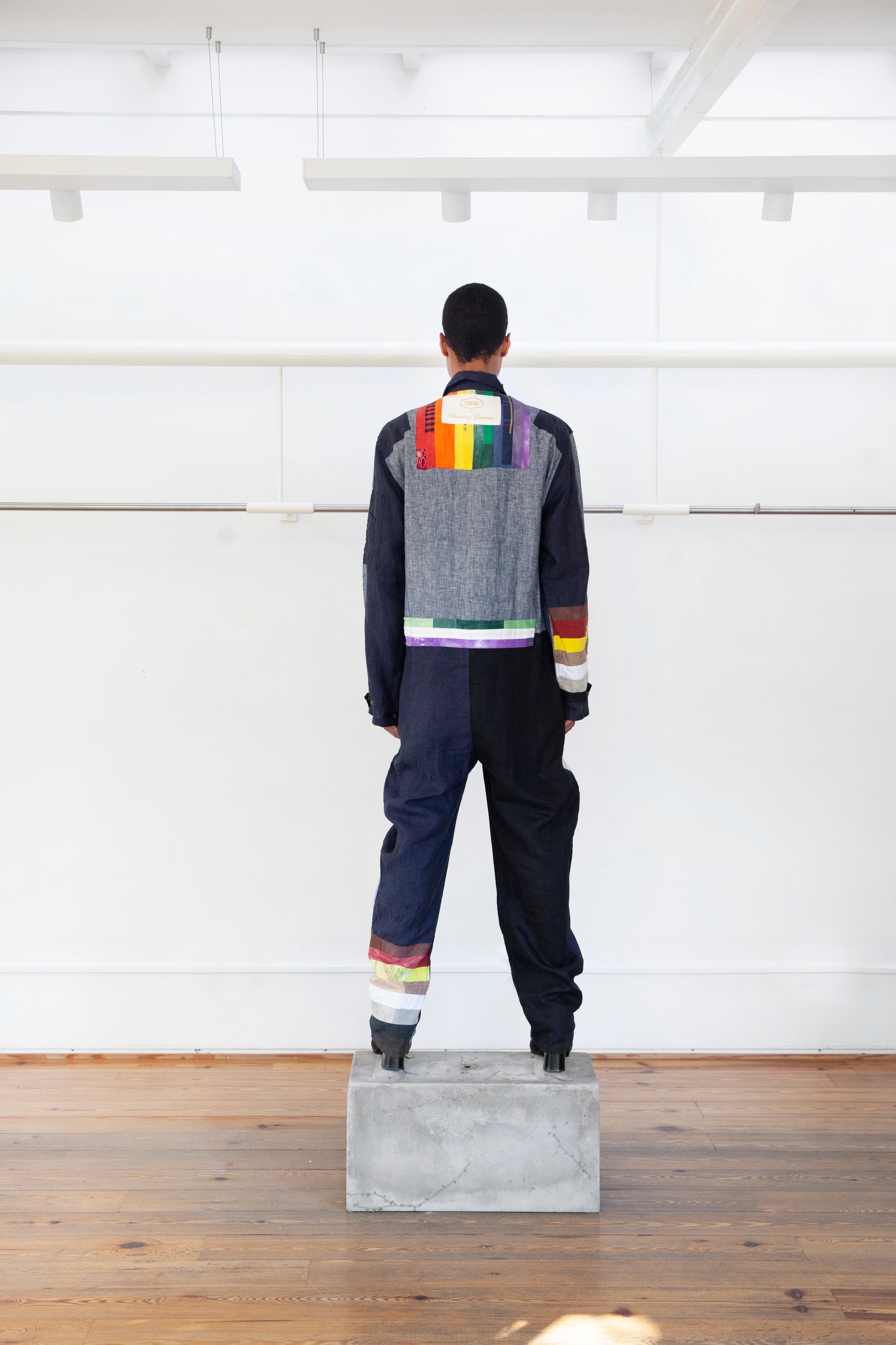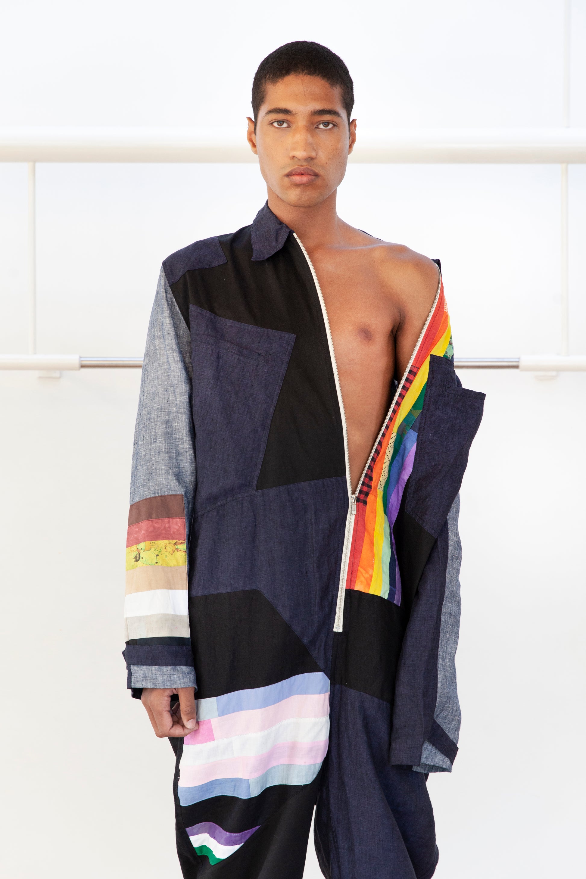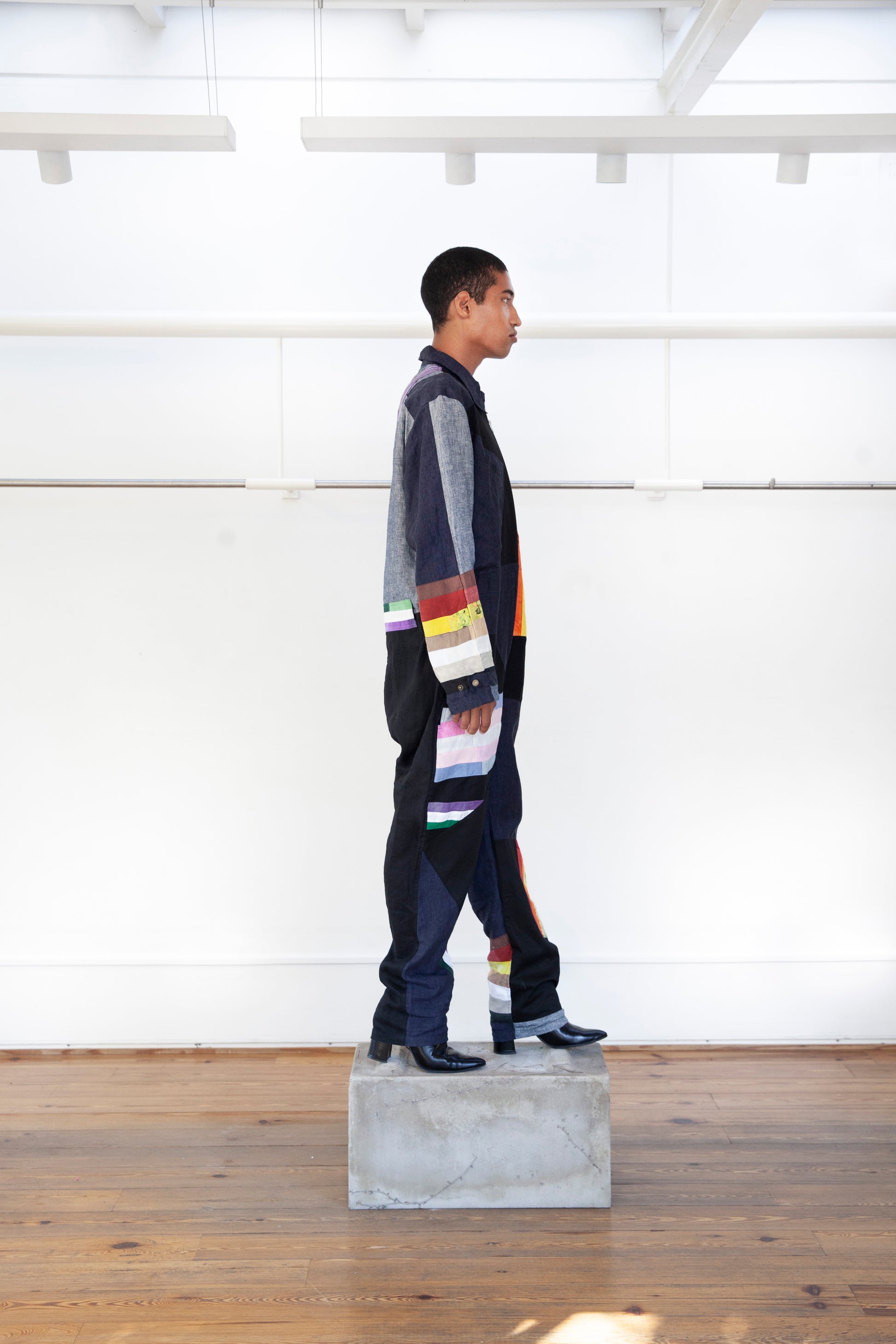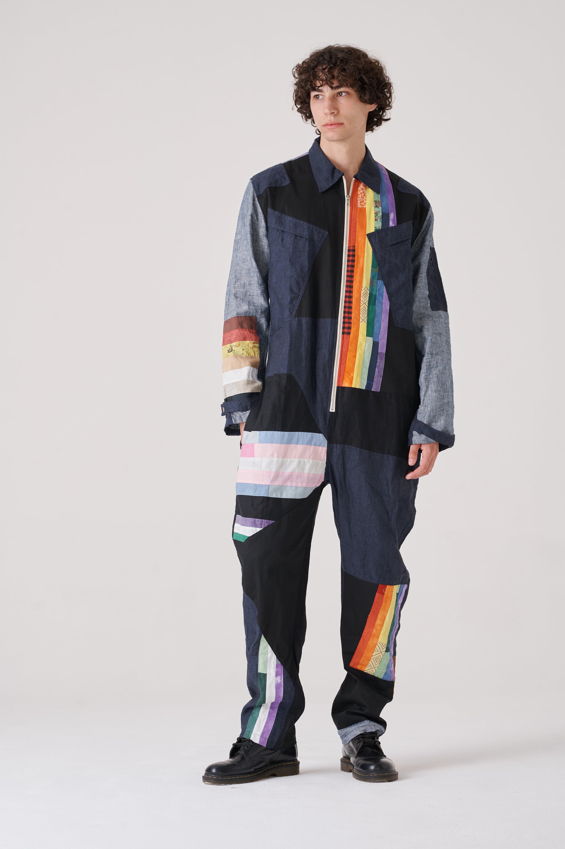 Overall made of Italian linen, 100% linen, with a variety patch of fabrics. It has a contrasting front zip fastening,and pockets: two on the front, on the left sleeve, and on both sides at hip height. It has long sleeves and adjustable cuffs. The bottom part has a conventional length. The fit is regular and creates a silhouette that highlights the body shape.