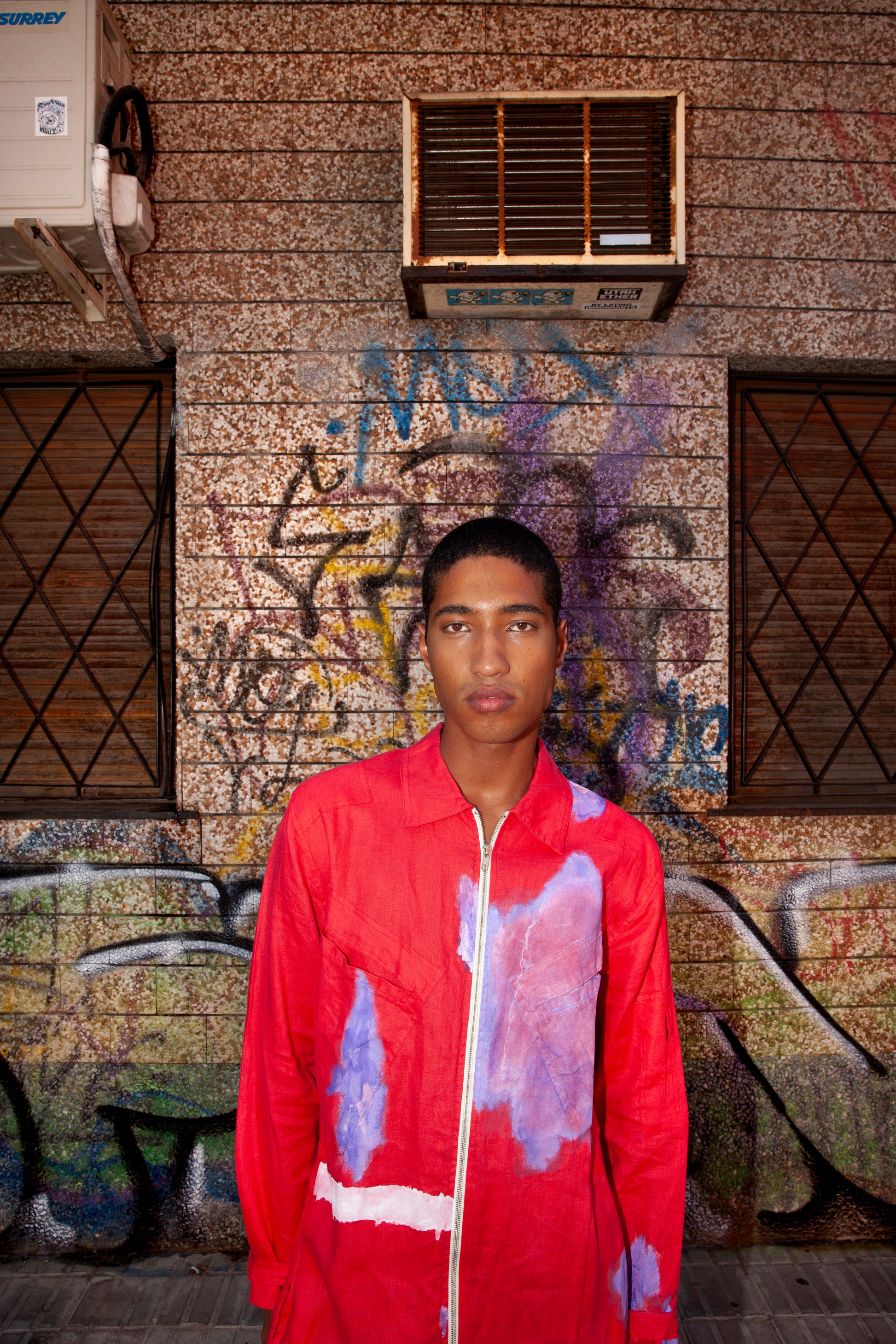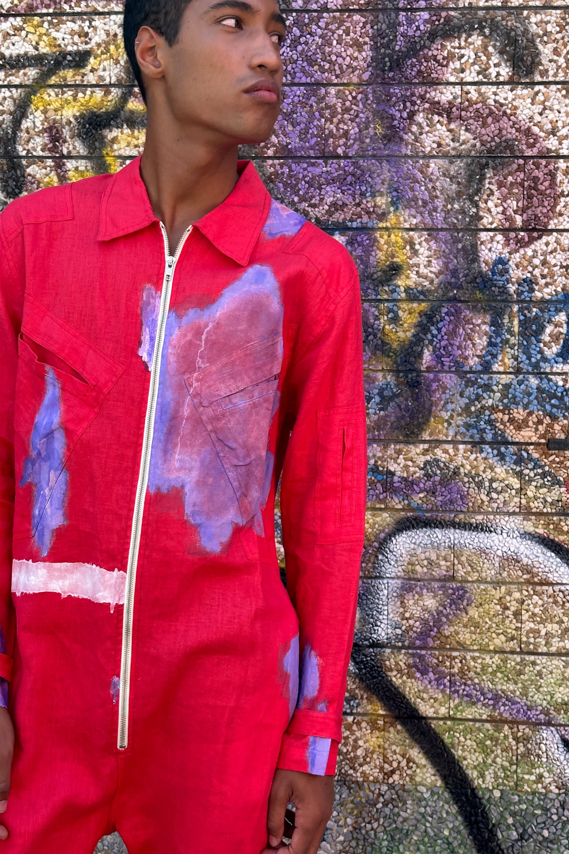 Overall made of Italian linen, 100% linen. It has a contrasting front zip fastening, two on the front, a pocket on the left sleeve, and pockets on both sides at hip height. It has long sleeves and adjustable epaulettes on the cuffs. The bottom part has a conventional length. The fit is regular and creates a silhouette that highlights the body shape.