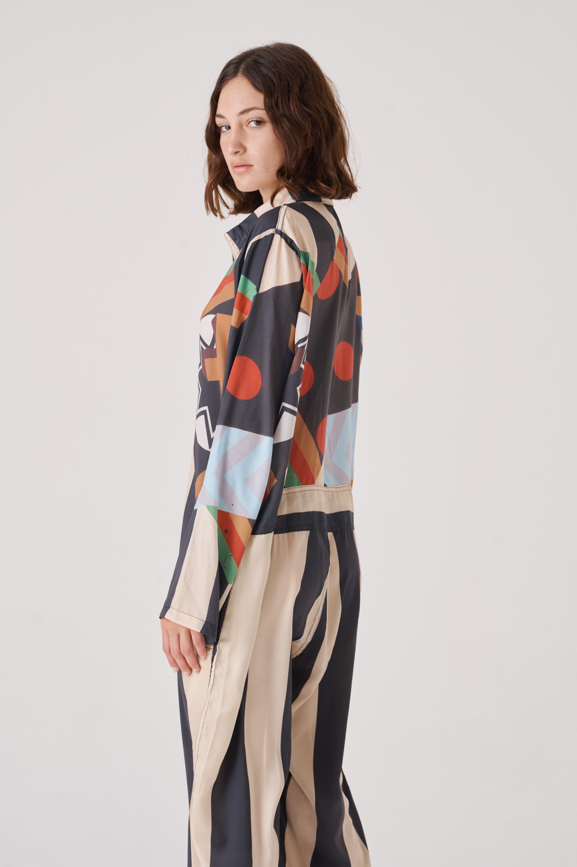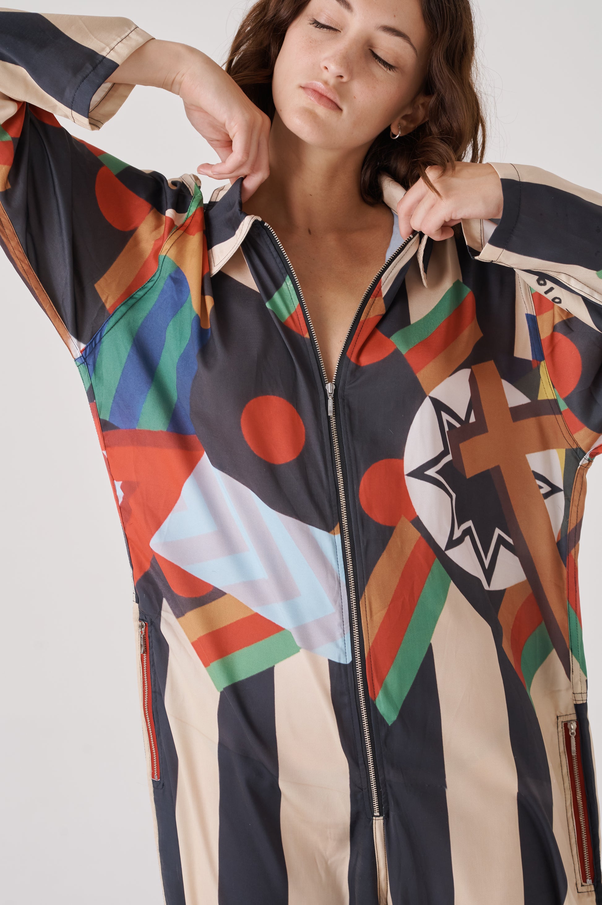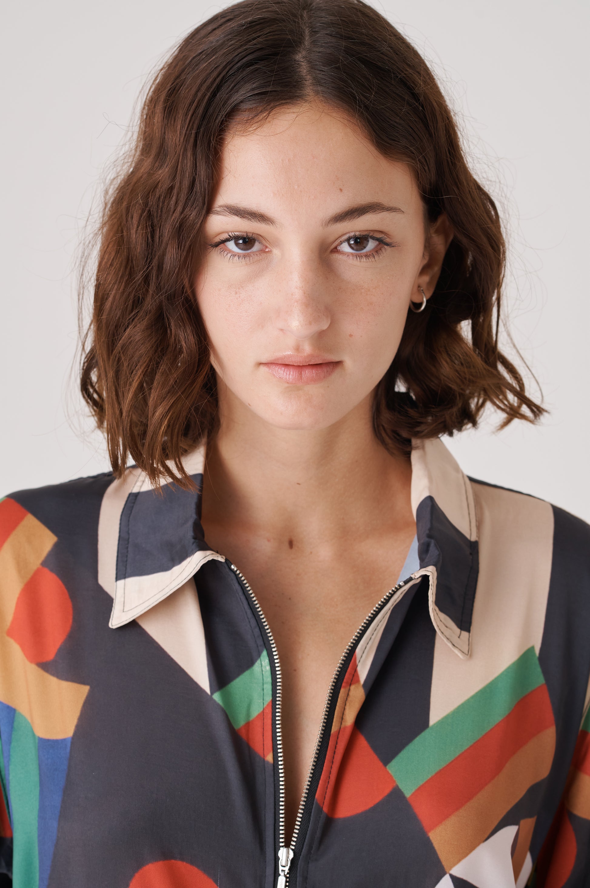 Overall made of similar to silk, 100% poly. It has a contrasting front zip fastening, and pockets on both sides at hip height. It has long sleeves and adjustable cuffs. The bottom part has a conventional length. The fit is regular and creates a silhouette that highlights the body shape.