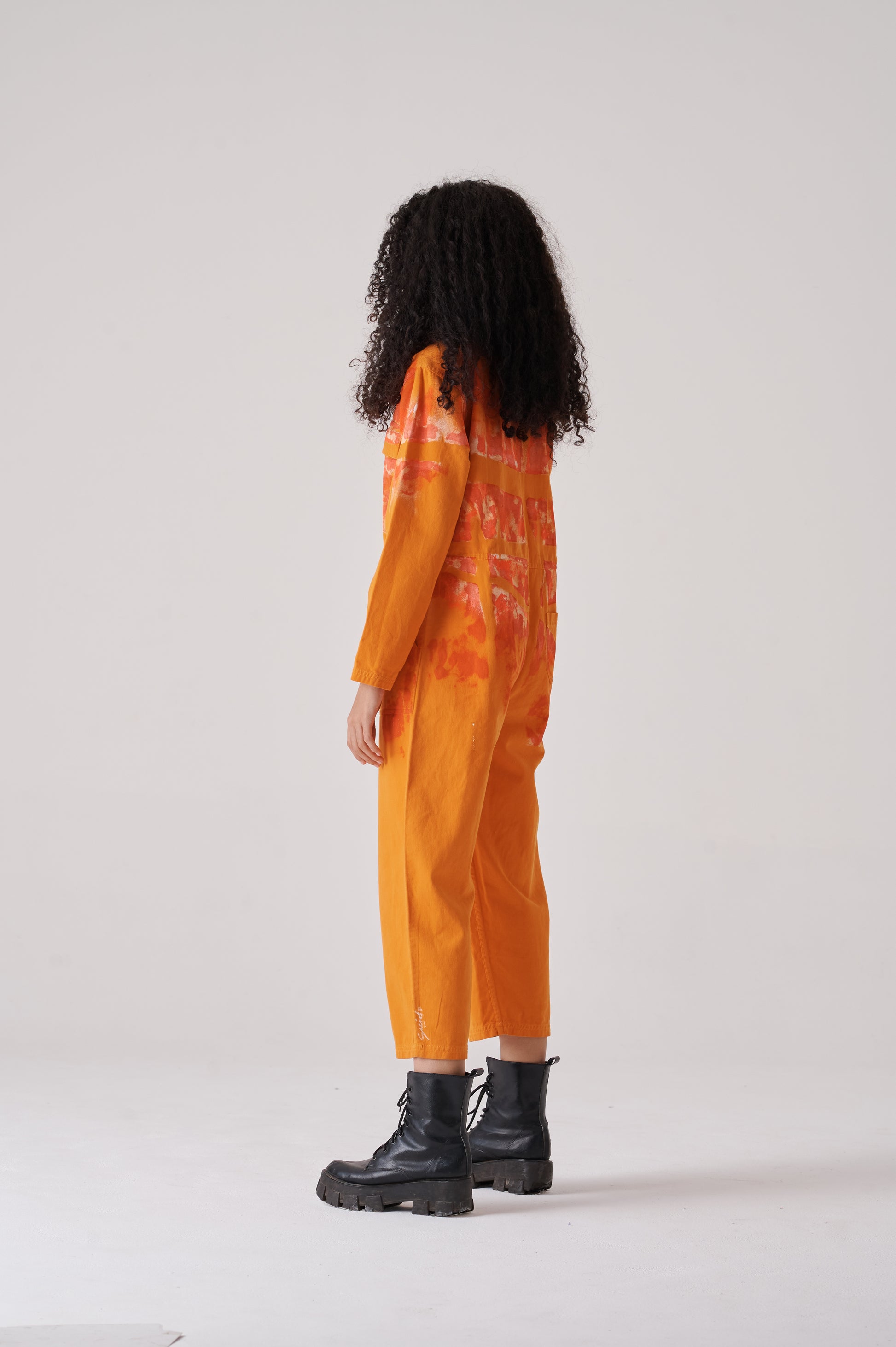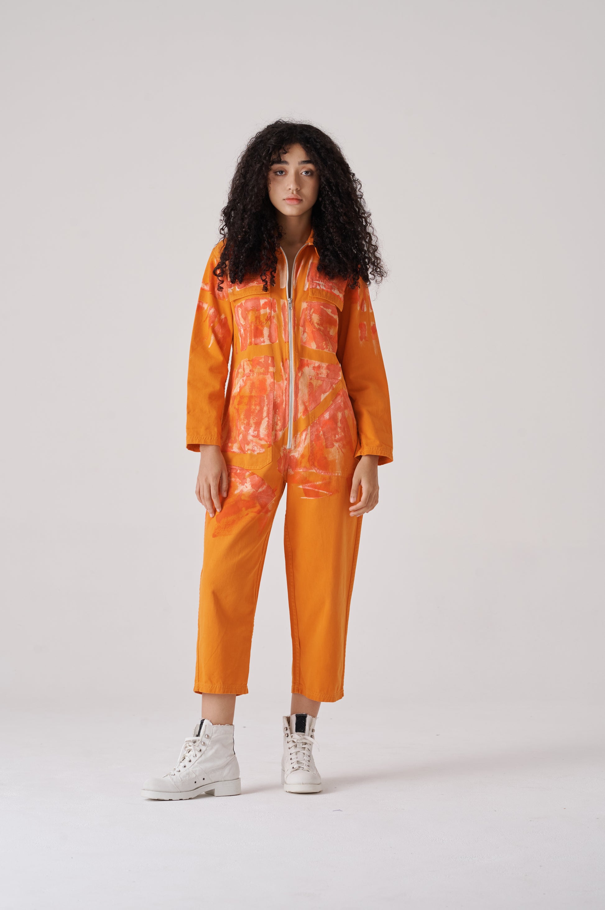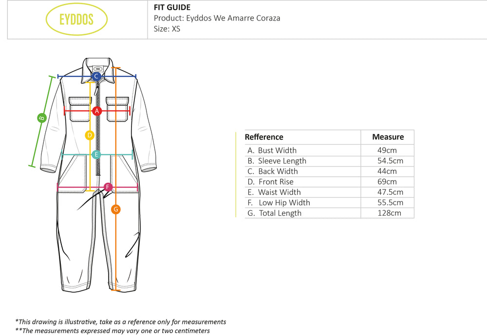Overall made of canvas, 98%cotton 2%spandez. It has a contrasting front zip fastening. The sleeves are shorts and the length of the pants is slightly shorter than the standard.The fit is straight, creating a wide and comfortable worker silhouette that allows for free movement.