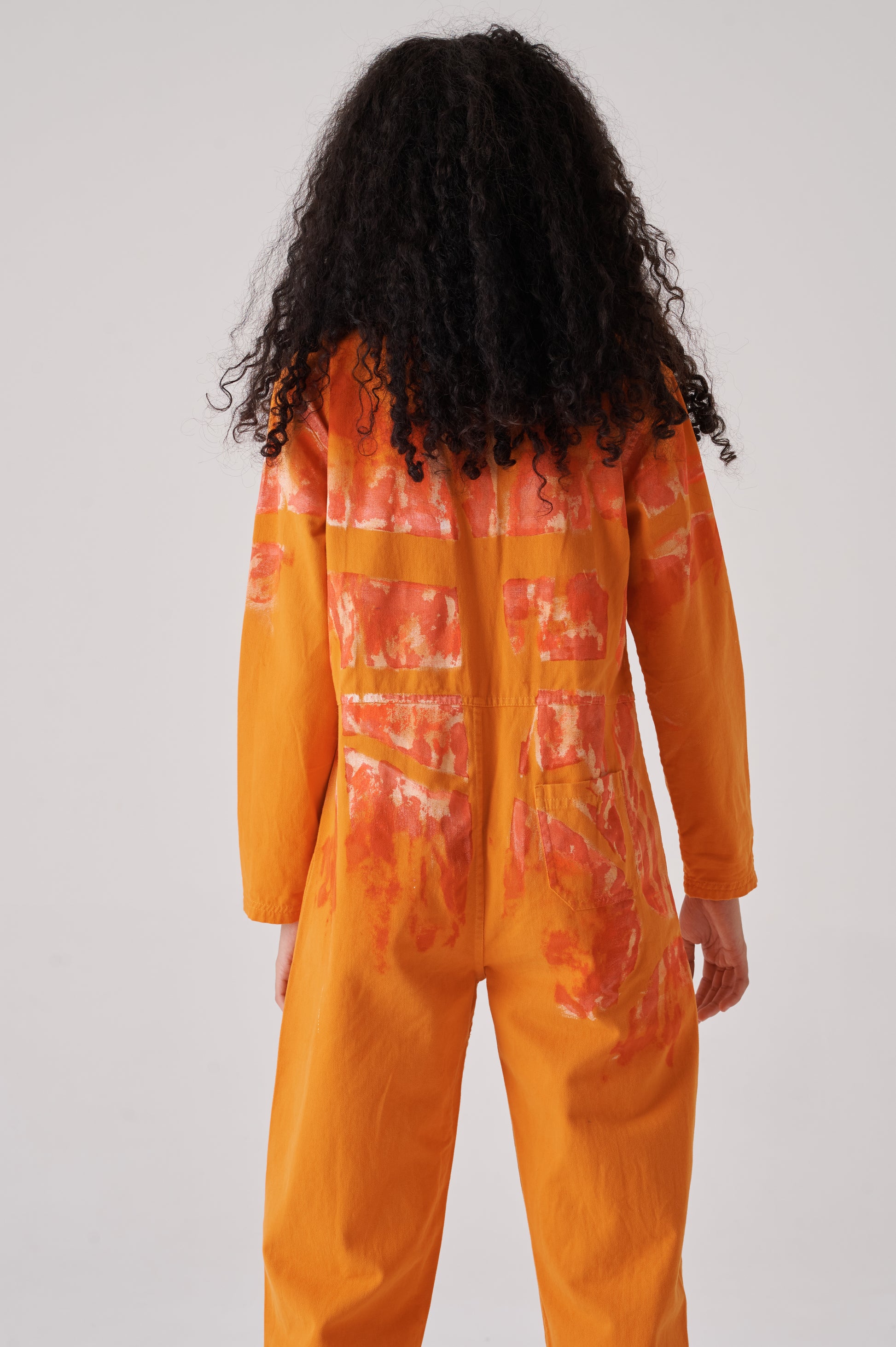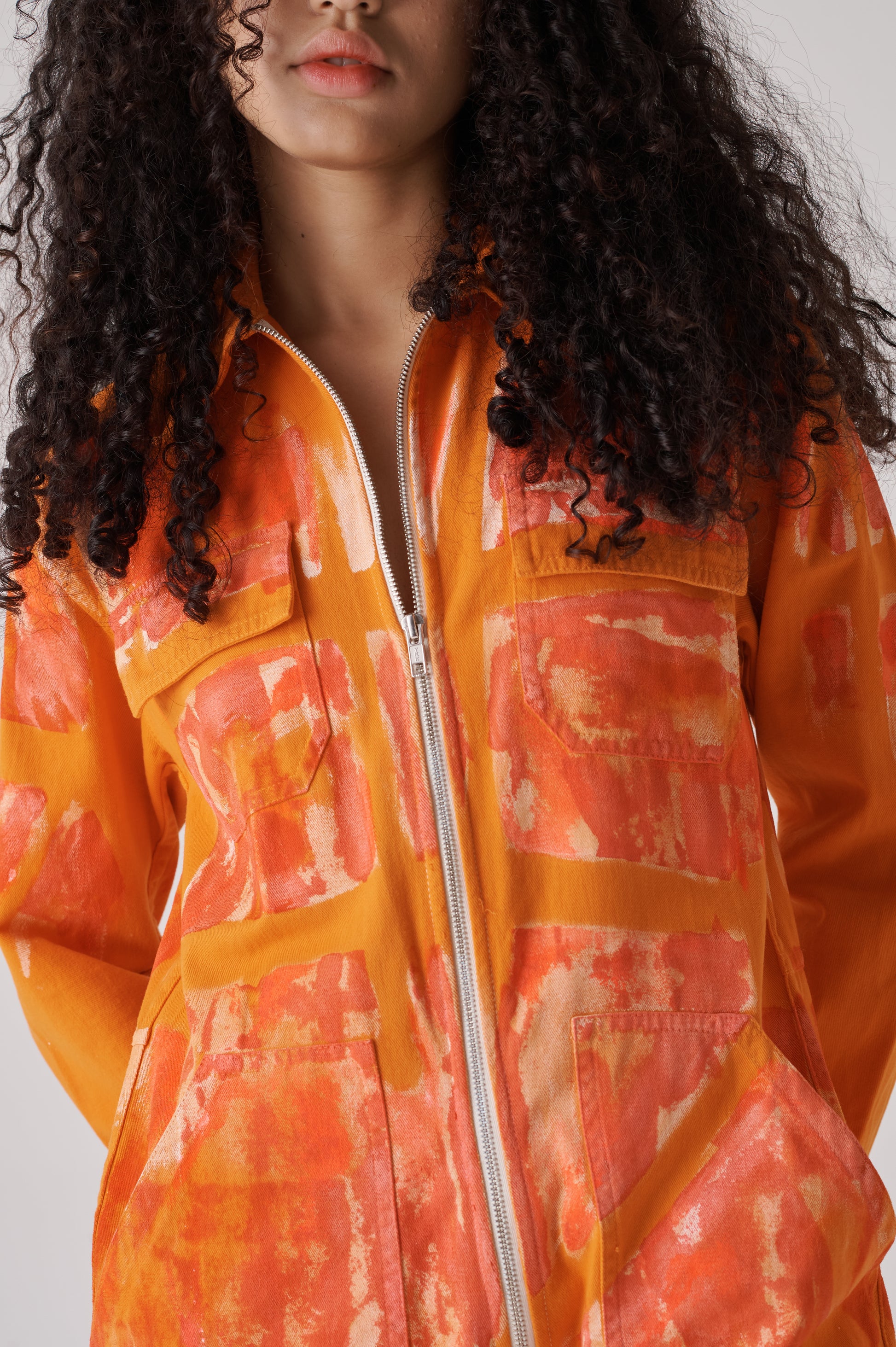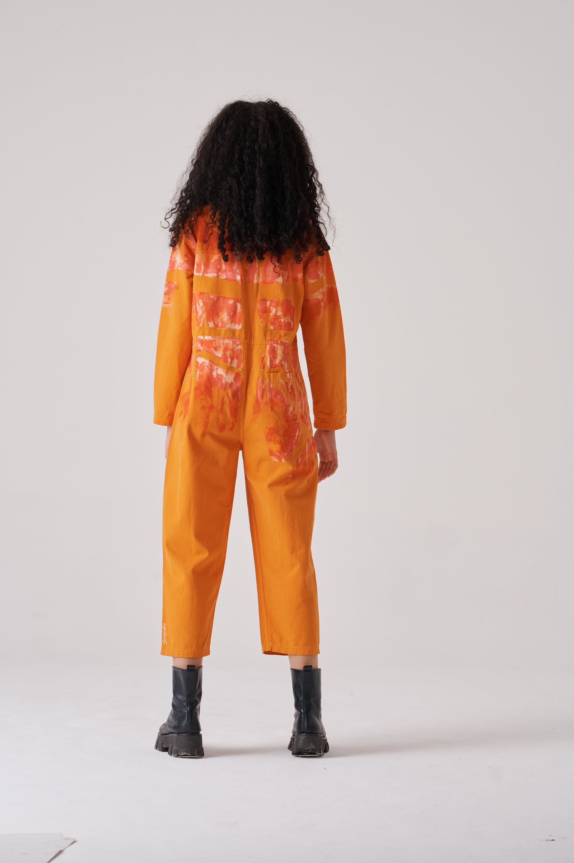 Overall made of canvas, 98%cotton 2%spandez. It has a contrasting front zip fastening. The sleeves are shorts and the length of the pants is slightly shorter than the standard.The fit is straight, creating a wide and comfortable worker silhouette that allows for free movement.