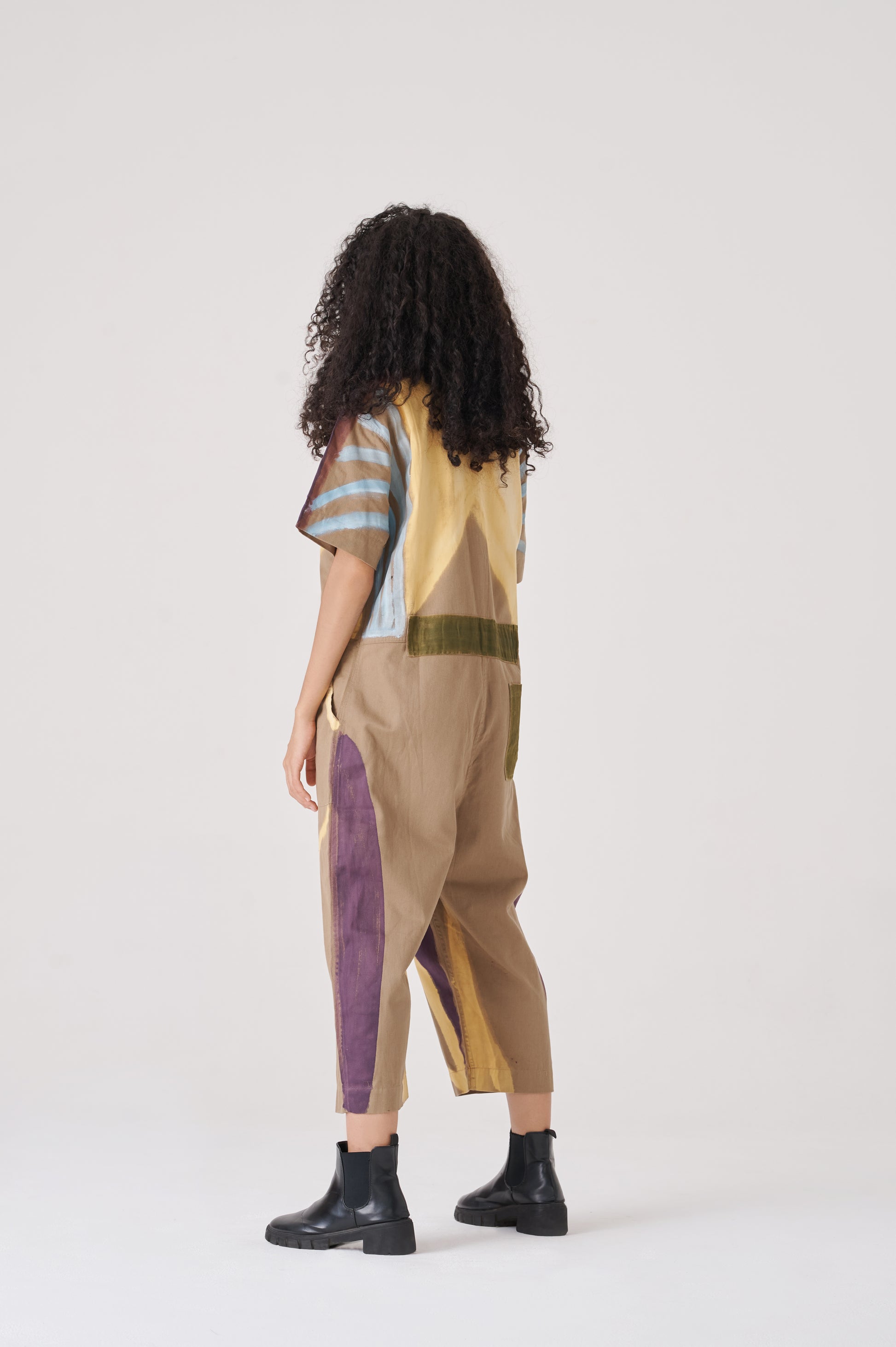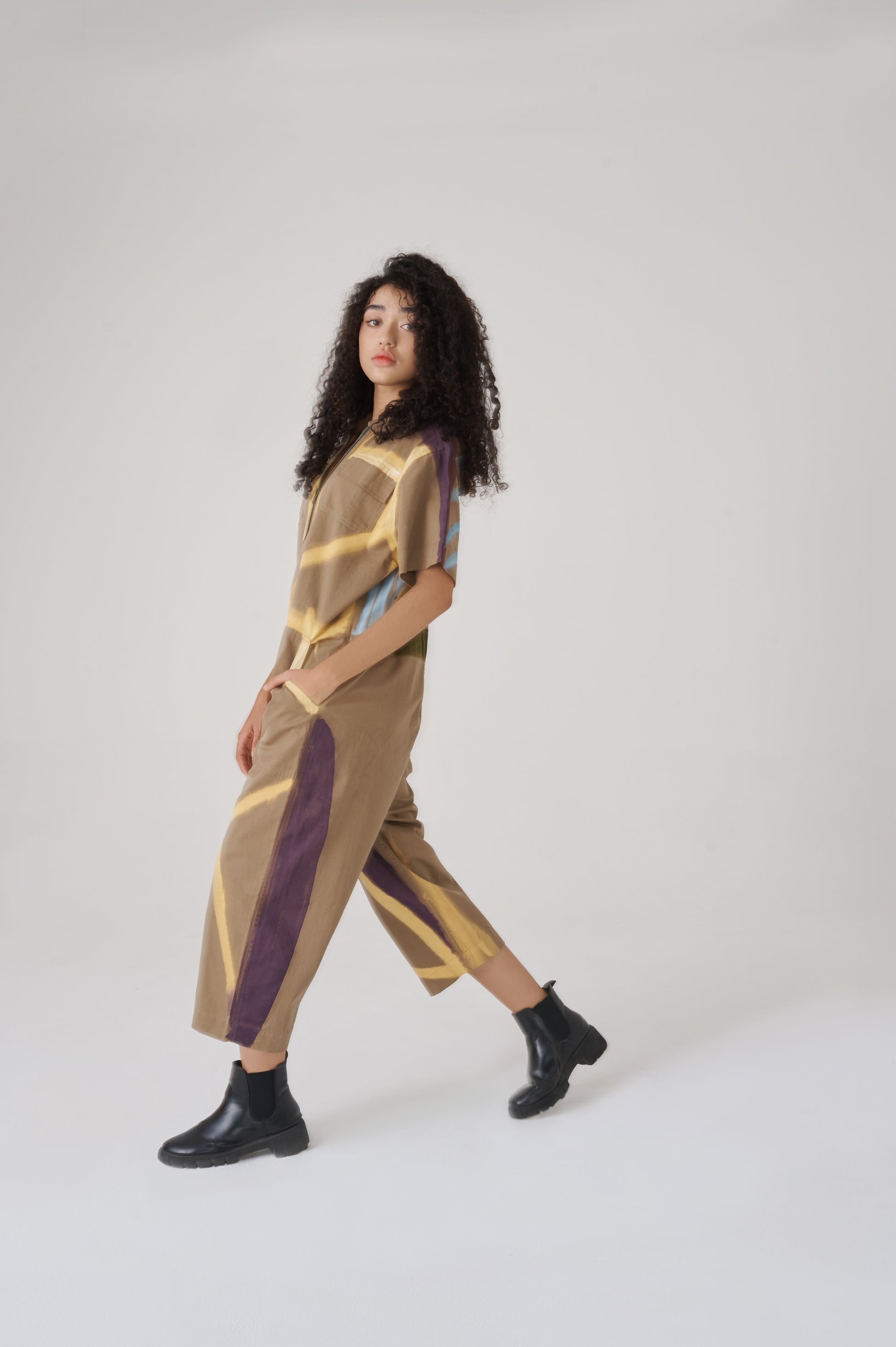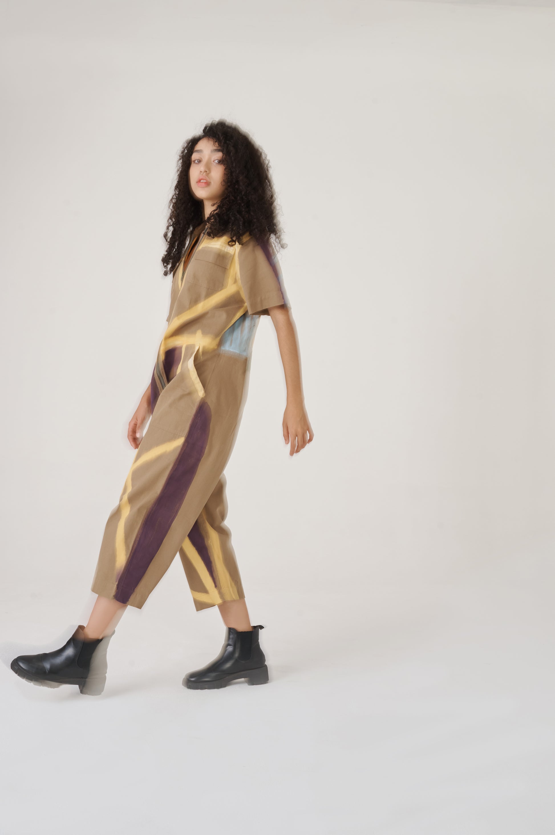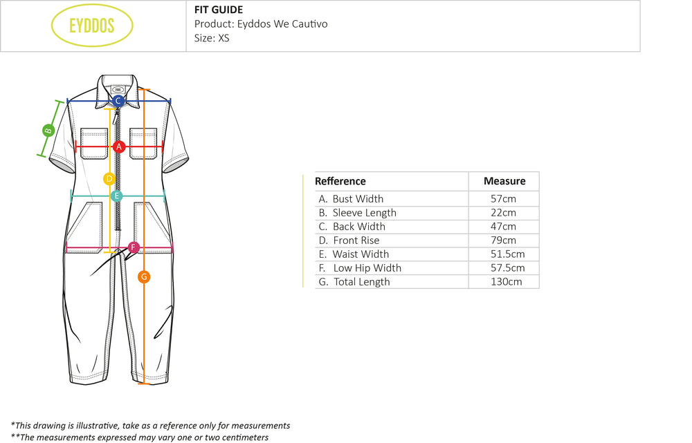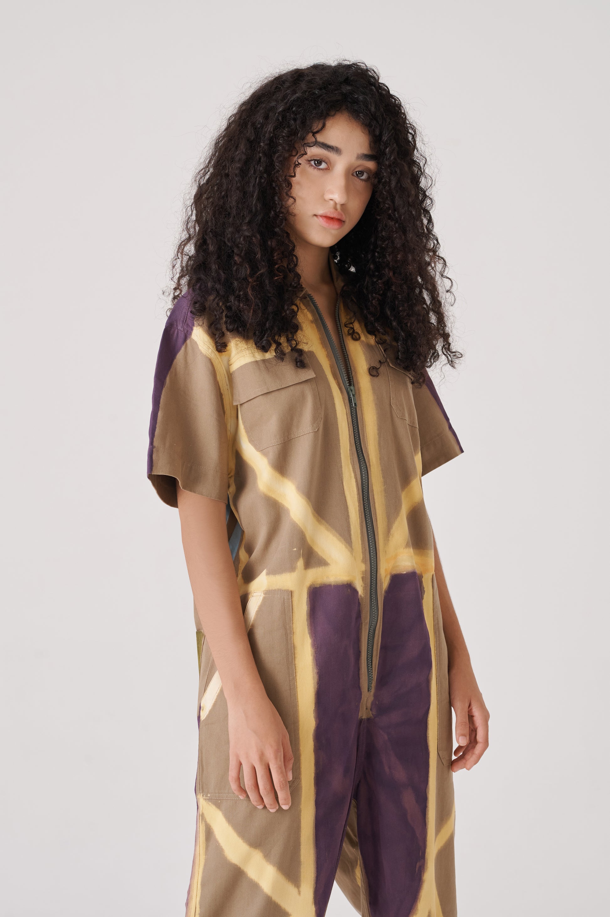 Overall made of canvas100% Cotton. It has a contrasting front zip fastening .The sleeves are shorts and the length of the pants is slightly shorter than the standard. The fit is straight, creating a wide and comfortable worker silhouette that allows for free movement. The fit is regular and creates a silhouette that highlights the body shape.
