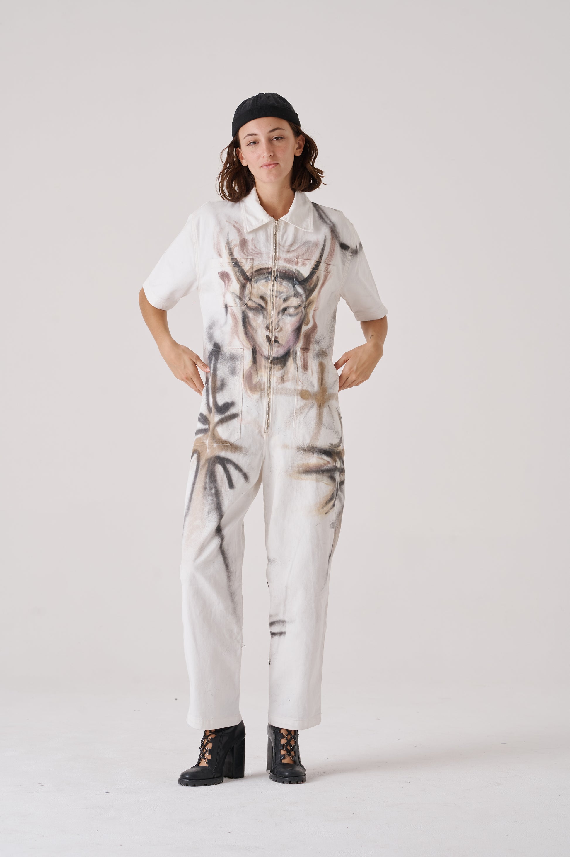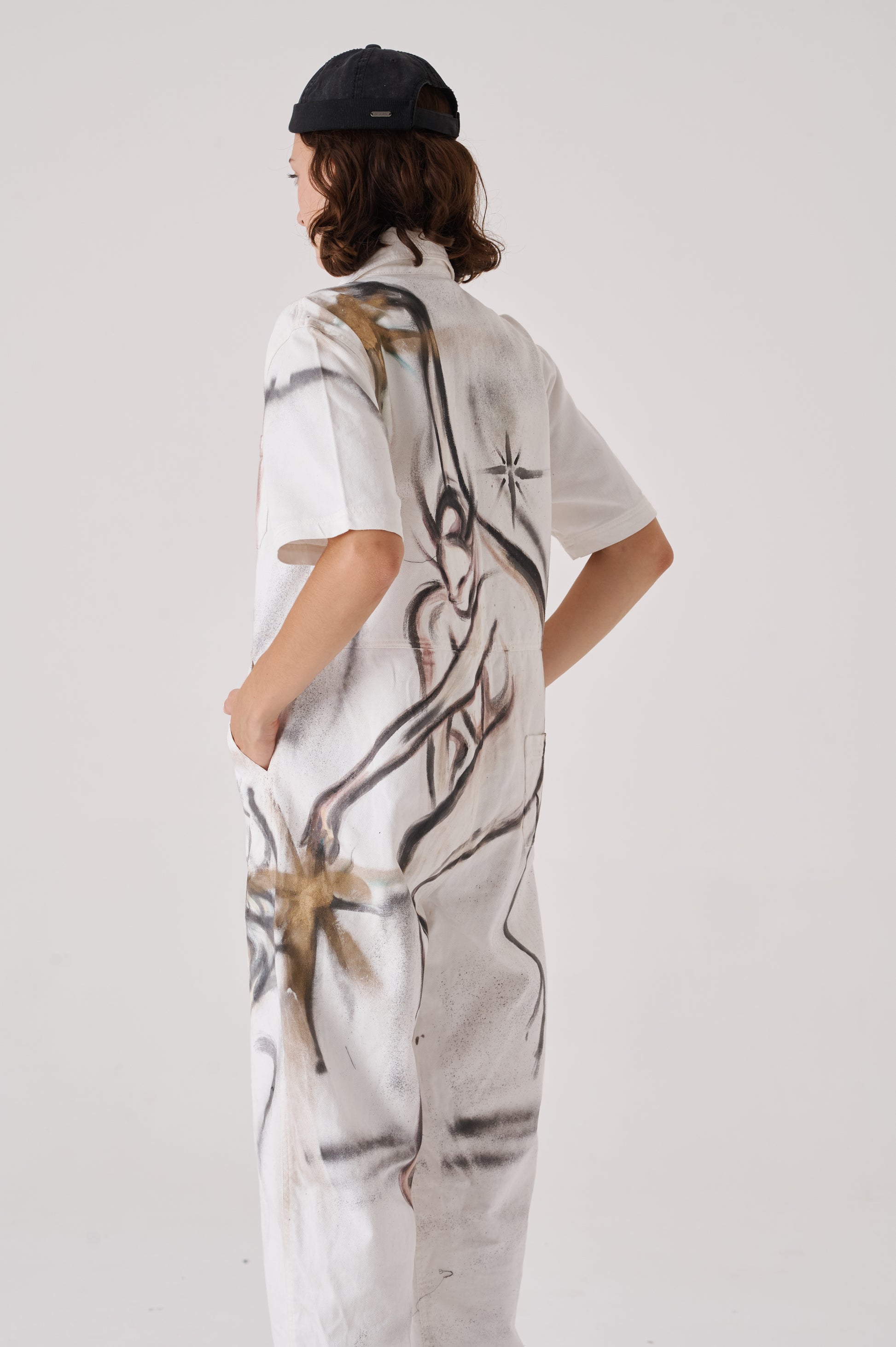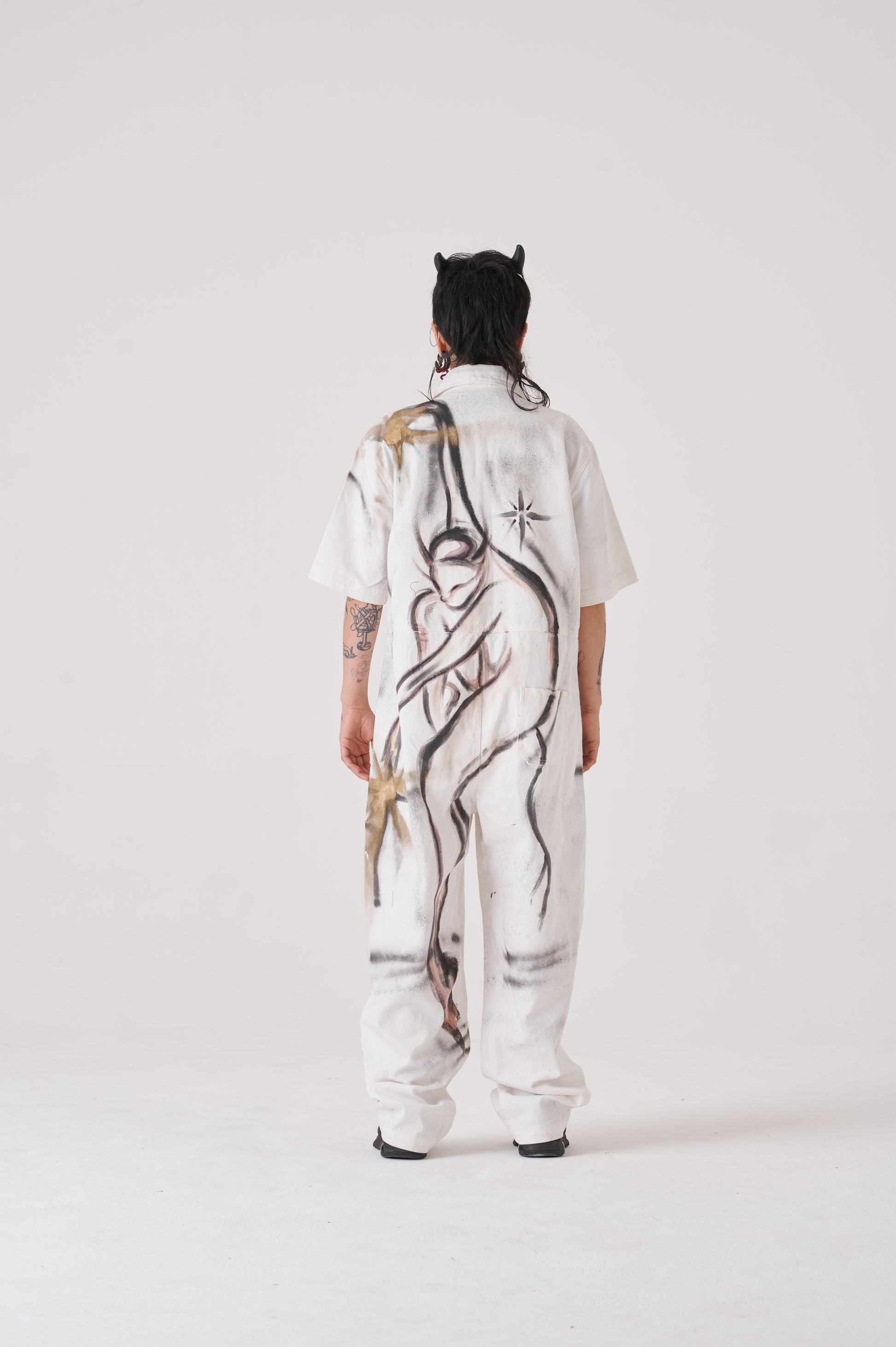 Overall made of canvas100% cotton. It has a tone-on-tone front zip fastening.The sleeves are shorts and the length of the pants is slightly shorter than the standard. The fit is straight, creating a wide and comfortable worker silhouette that allows for free movement. The fit is regular and creates a silhouette that highlights the body shape.
