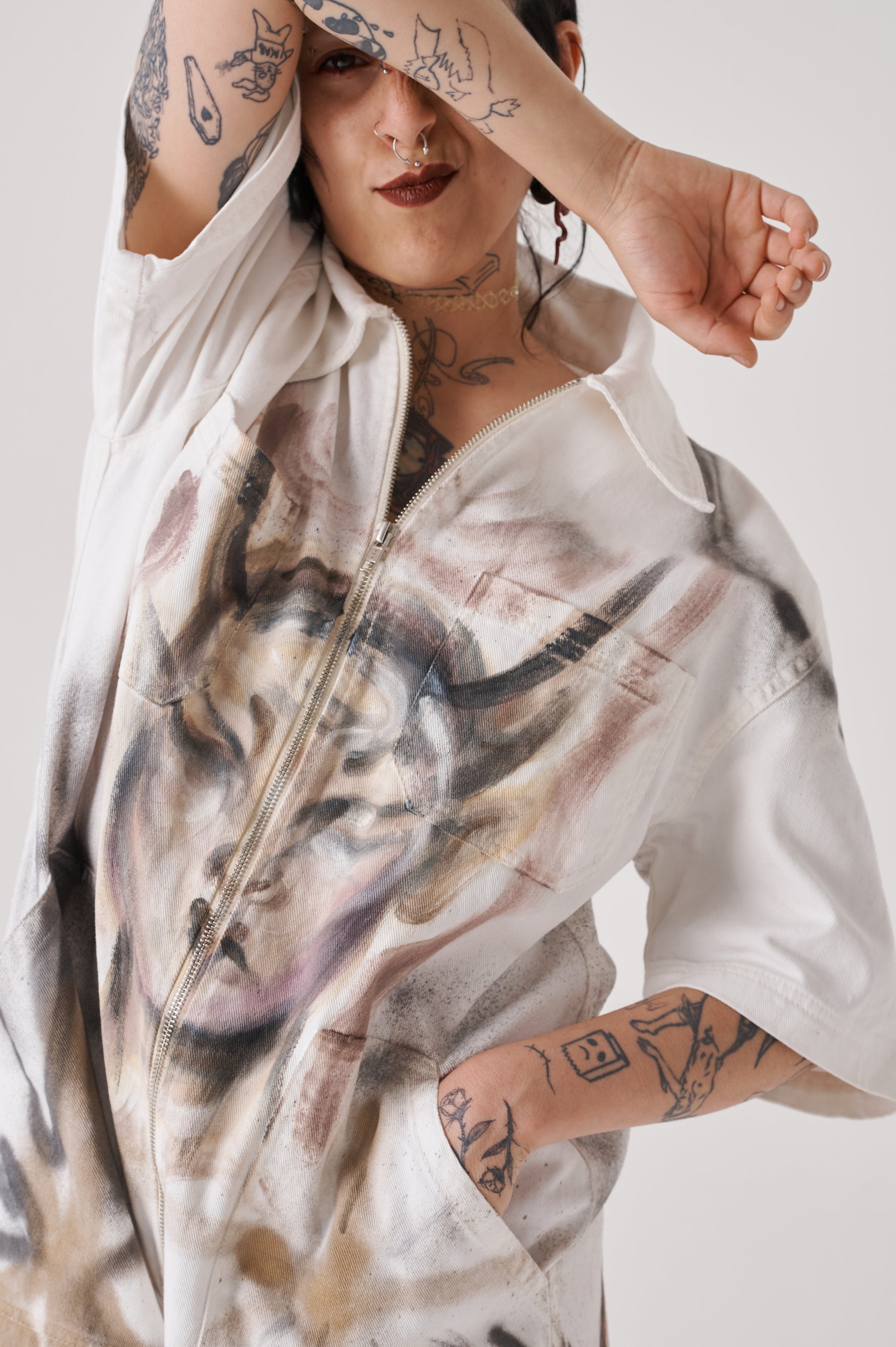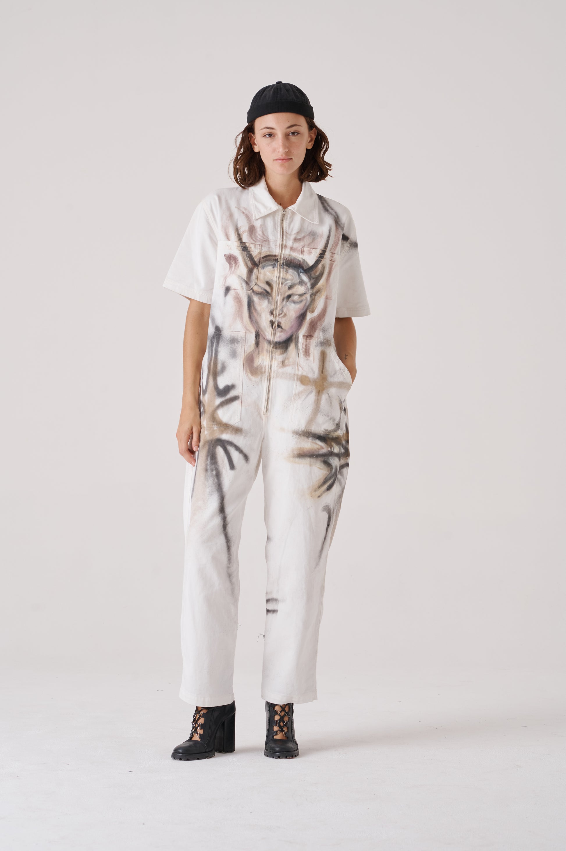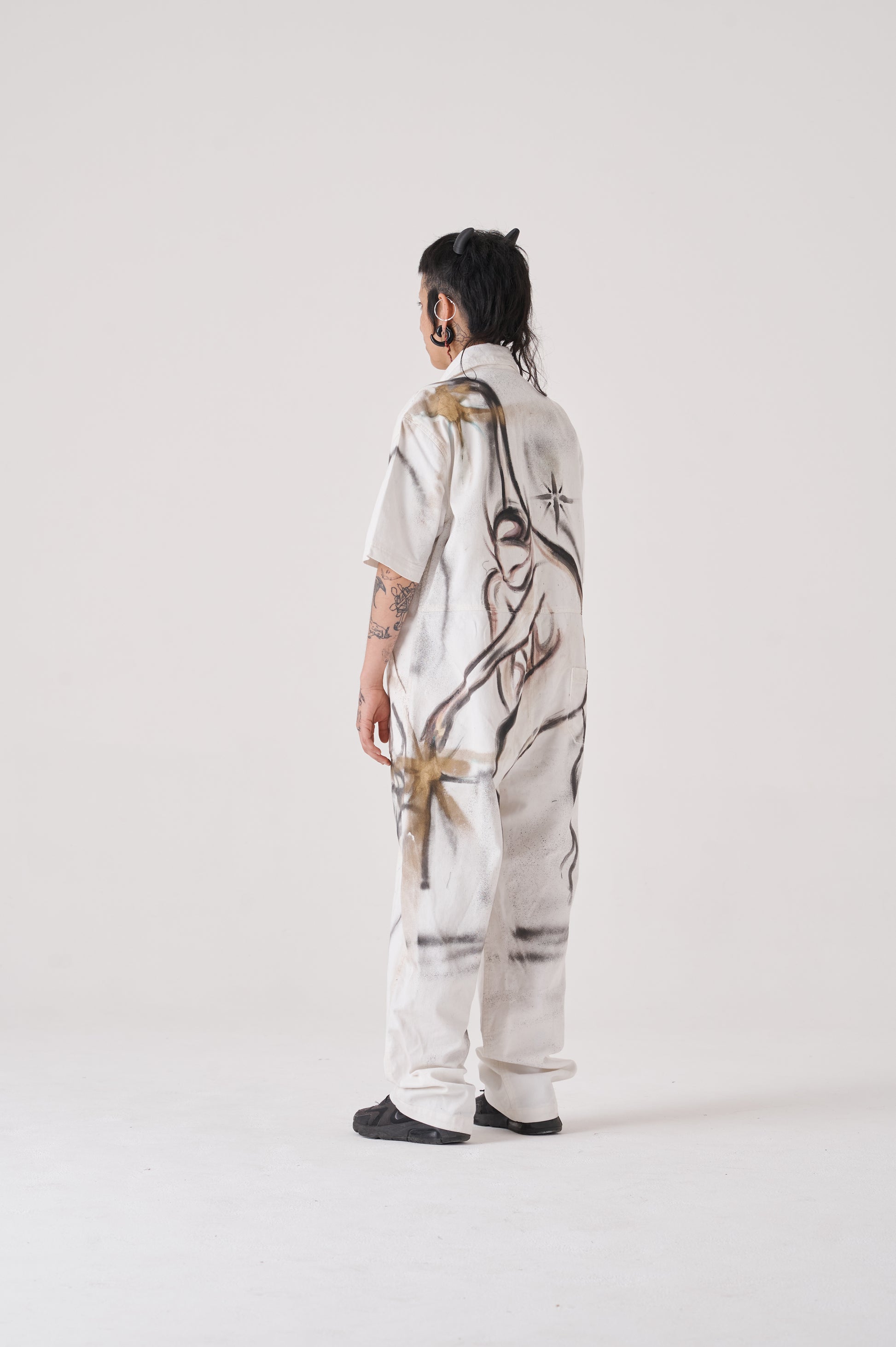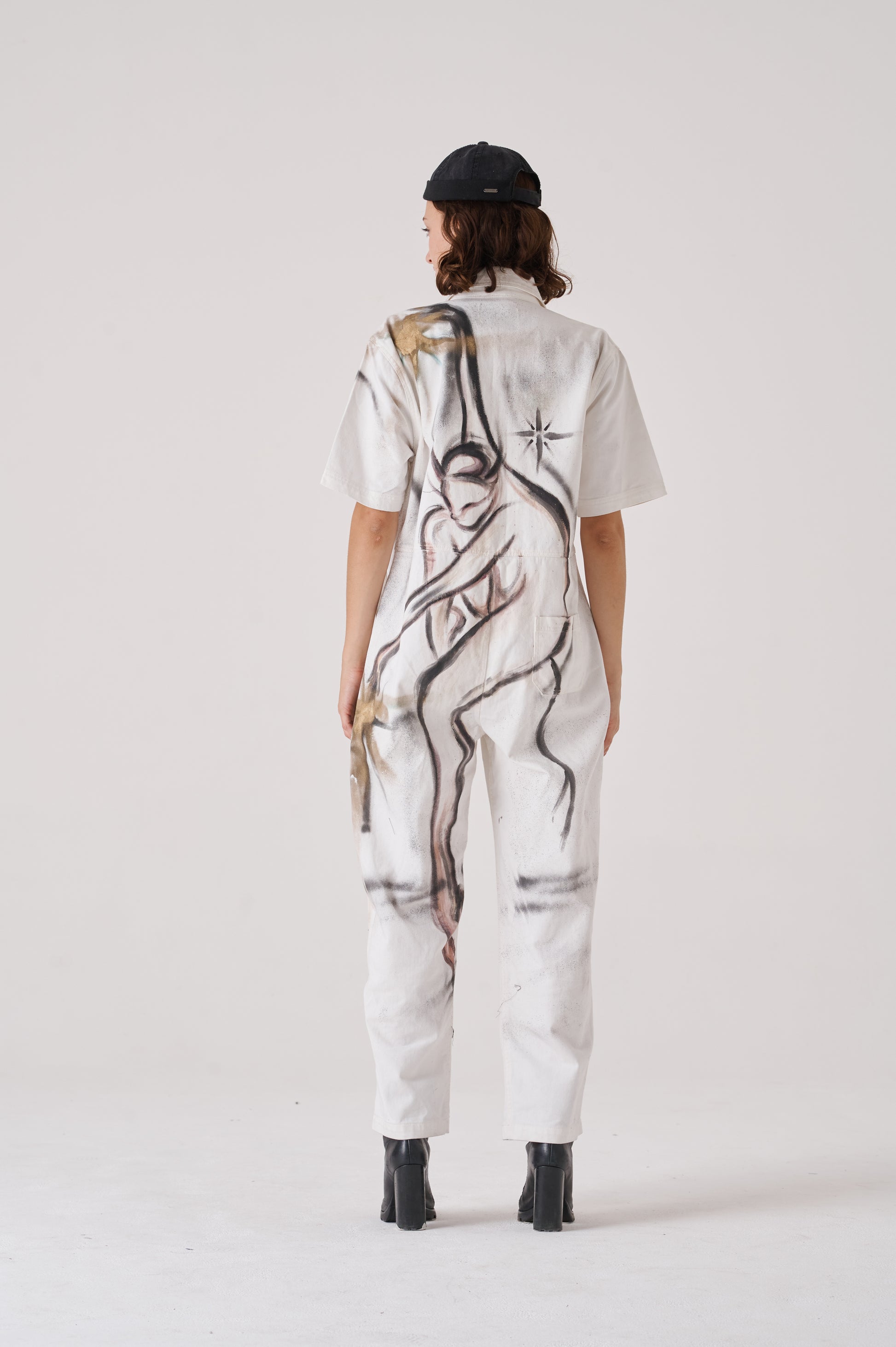 Overall made of canvas100% cotton. It has a tone-on-tone front zip fastening.The sleeves are shorts and the length of the pants is slightly shorter than the standard. The fit is straight, creating a wide and comfortable worker silhouette that allows for free movement. The fit is regular and creates a silhouette that highlights the body shape.