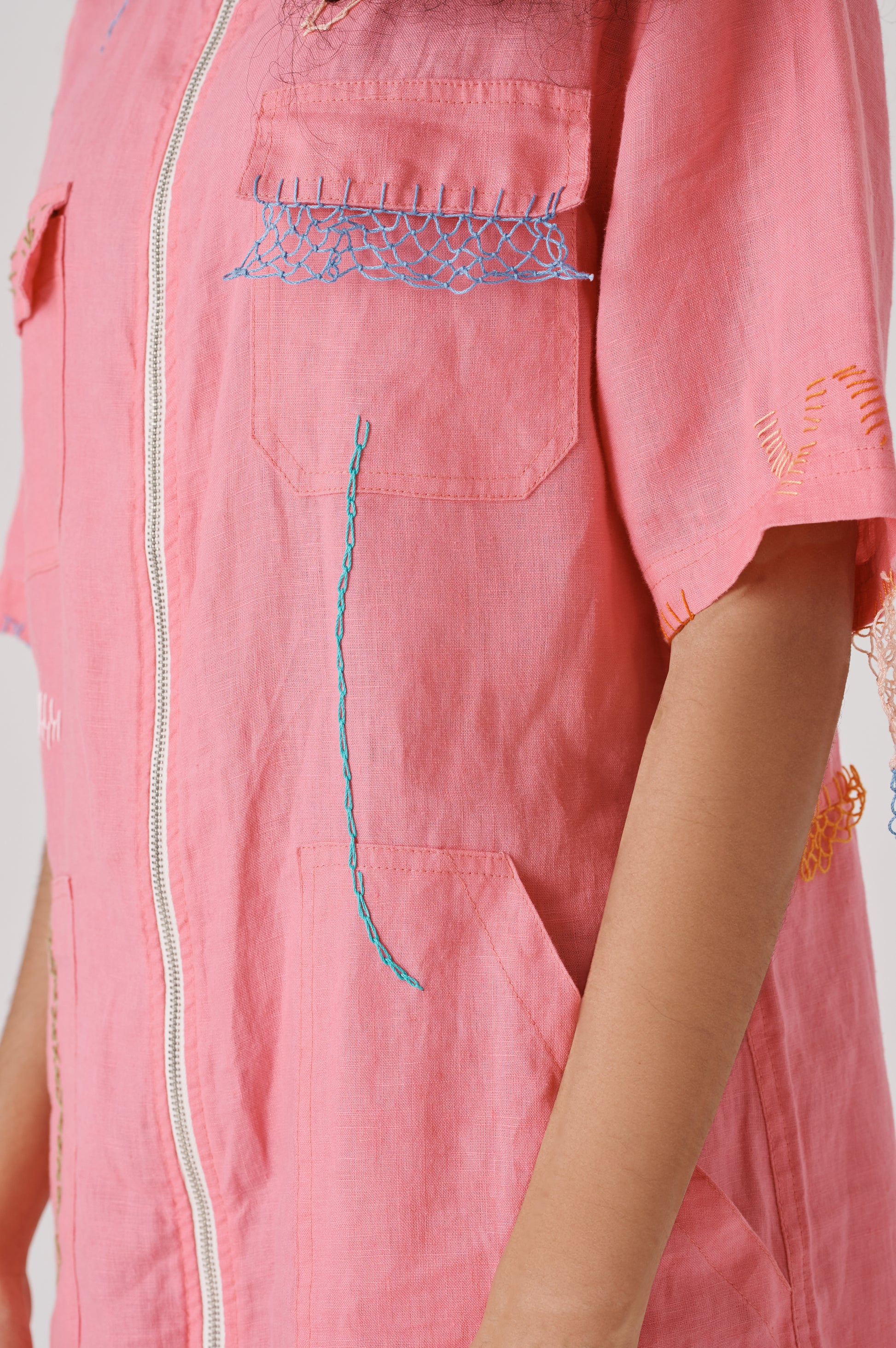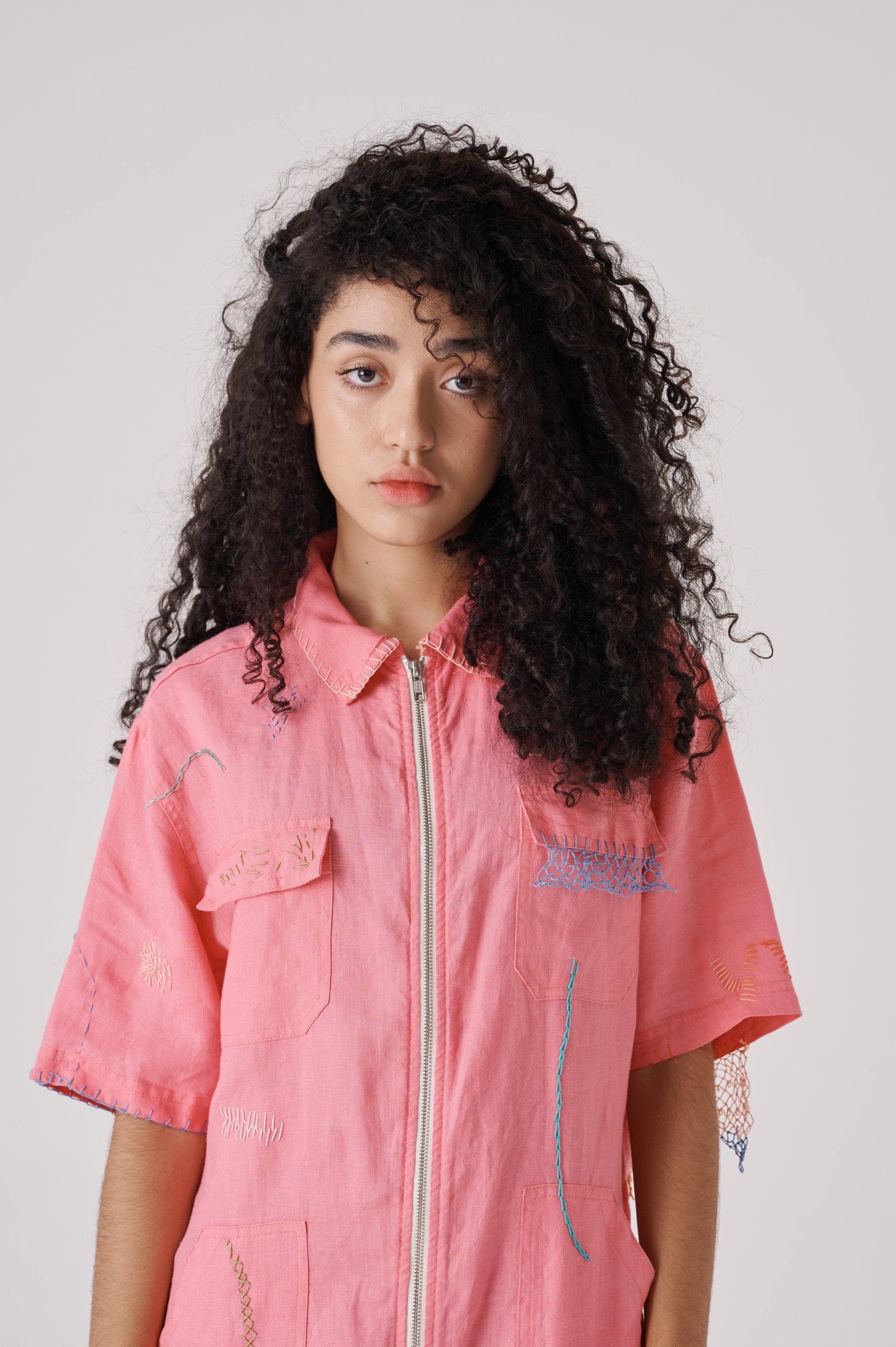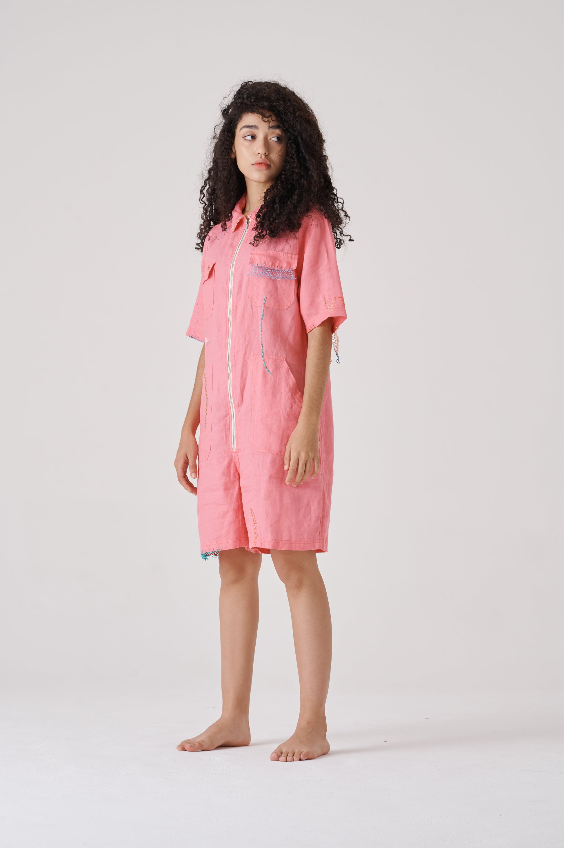 Overall made of linen, 100% linen. It has a contrasting front zip fastening. The sleeves and the bottom part are shorts.The fit is straight, creating a wide and comfortable worker silhouette that allows for free movement.