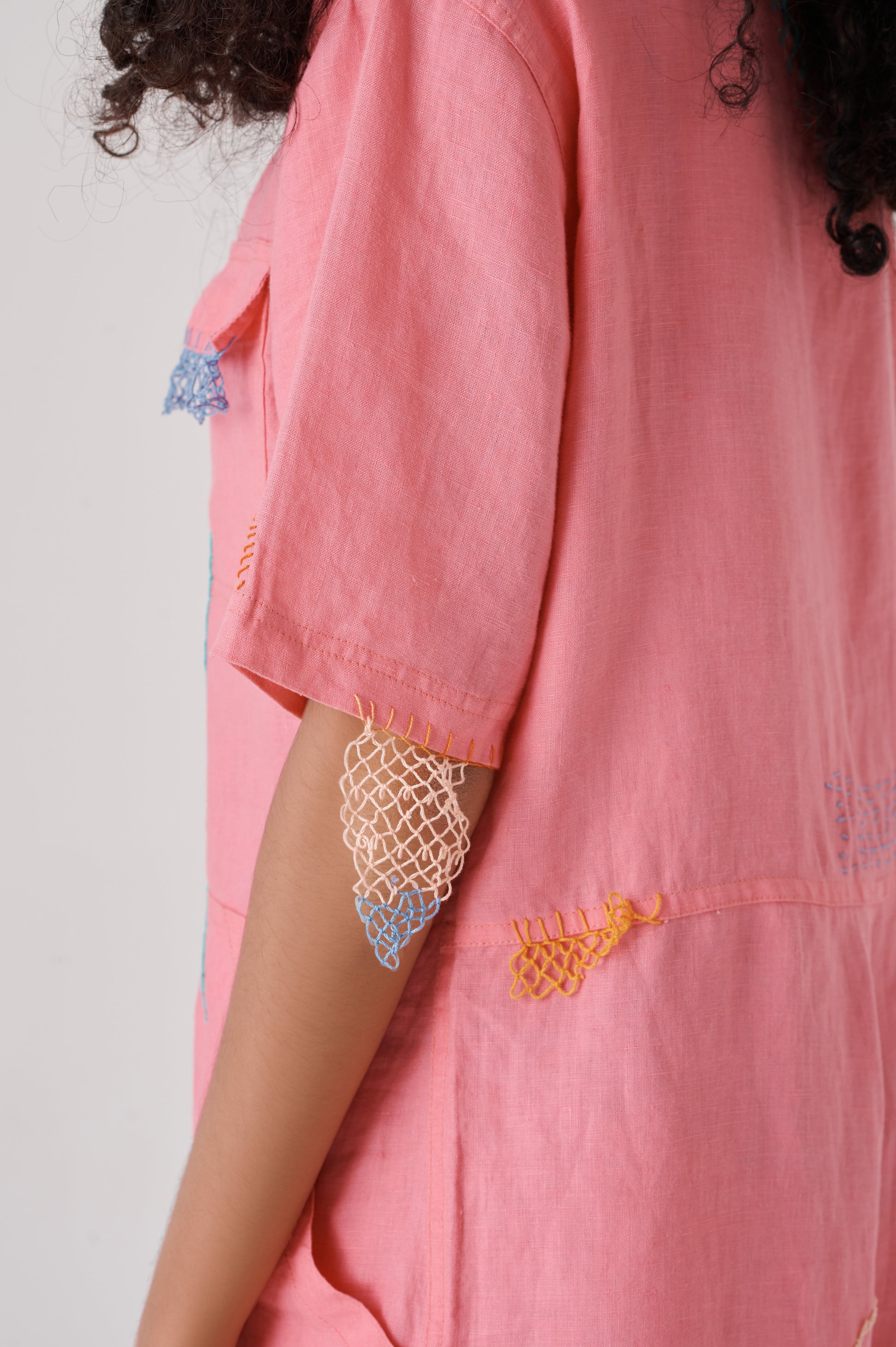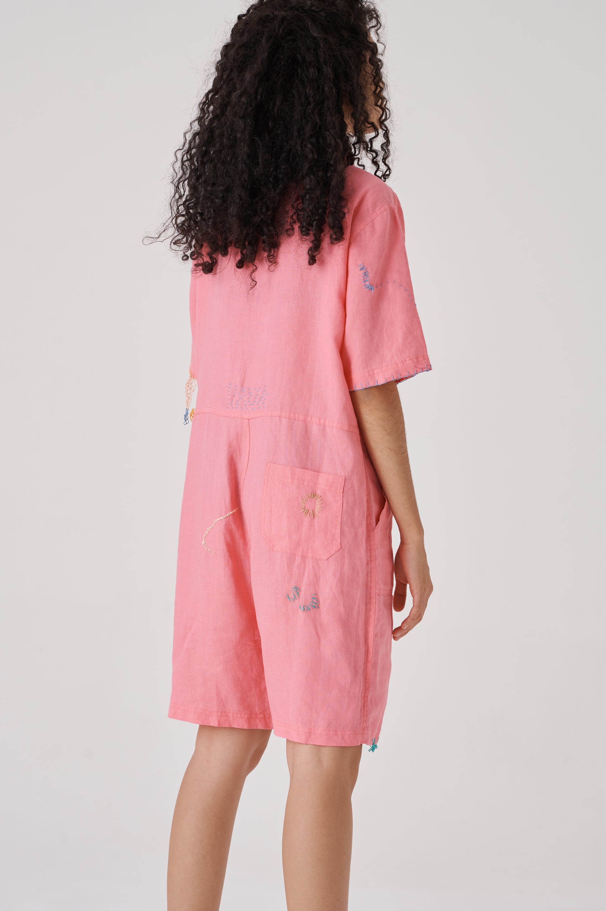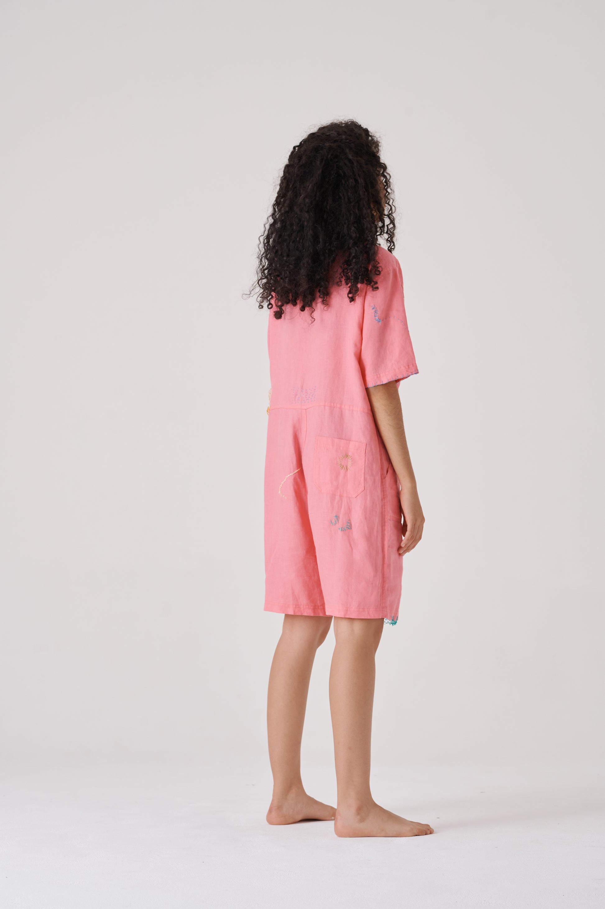 Overall made of linen, 100% linen. It has a contrasting front zip fastening. The sleeves and the bottom part are shorts.The fit is straight, creating a wide and comfortable worker silhouette that allows for free movement.