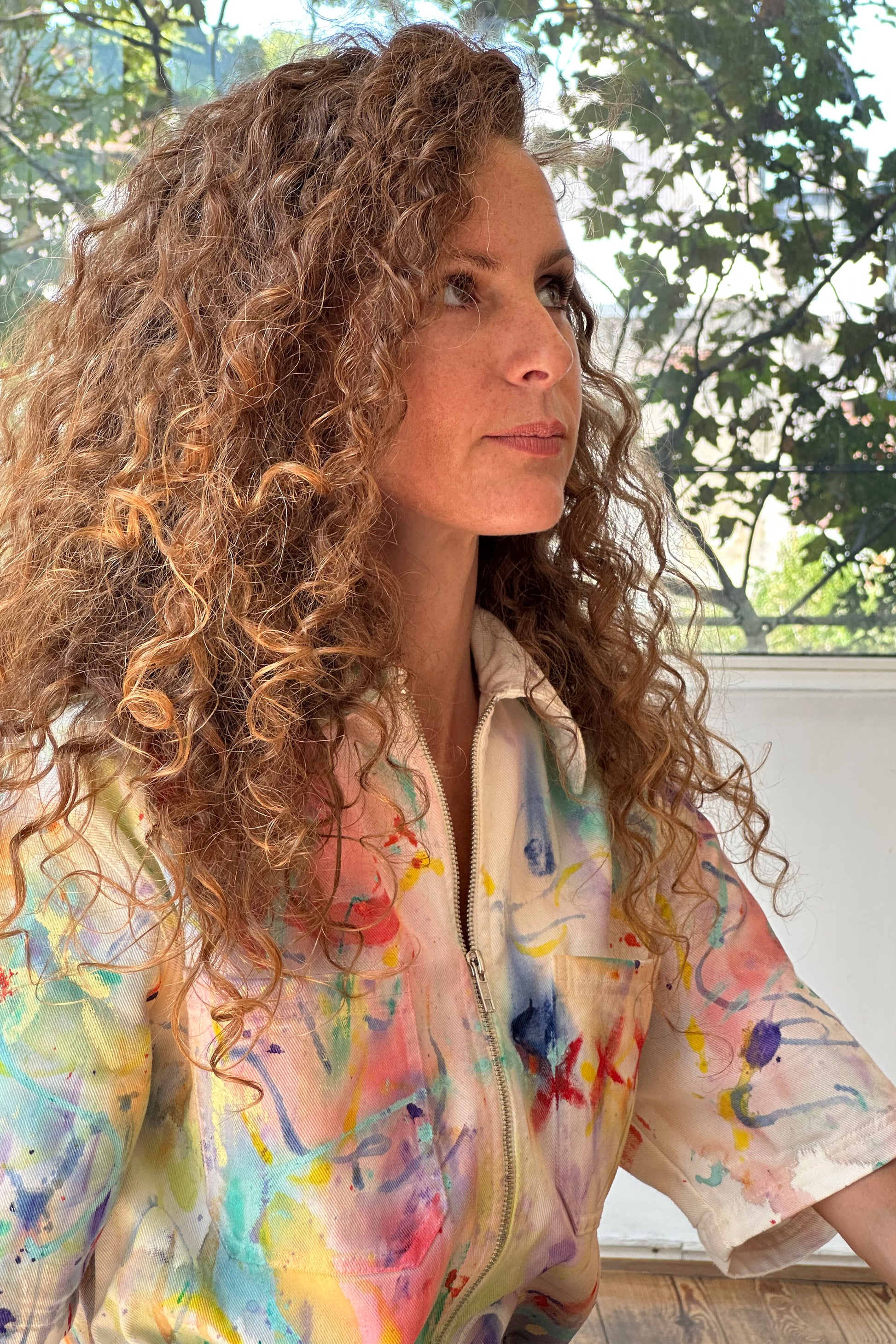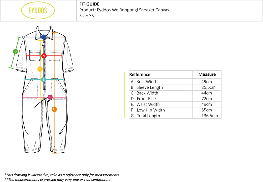 Overall made of canvas100% cotton. It has a tone-on-tone front zip fastening.The sleeves are shorts, and the length of the pants is slightly shorter than the standard. The fit is straight, creating a wide and comfortable worker silhouette that allows for free movement.